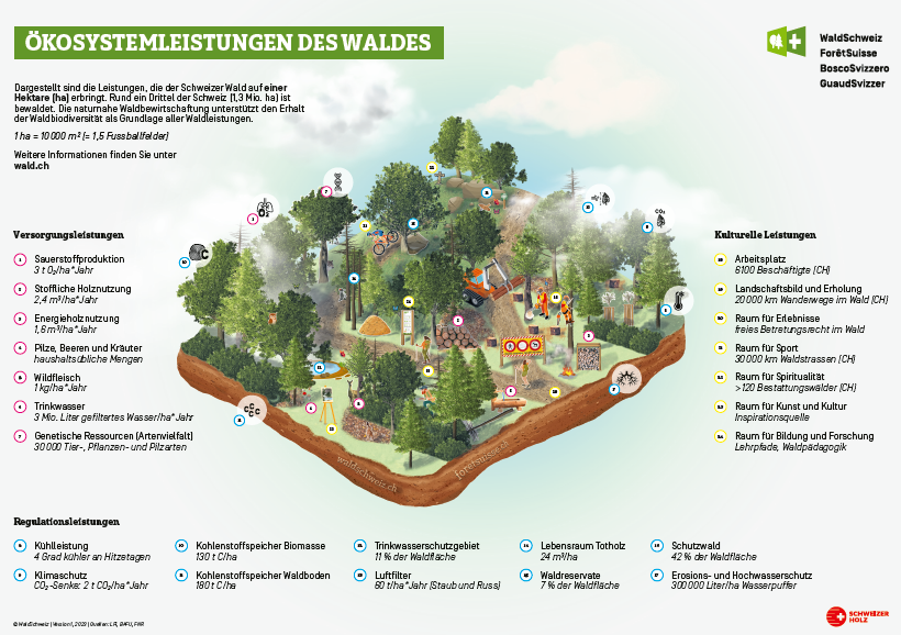 Eine strukturierte Übersicht von Waldfunktionen und Waldleistungen in der Schweiz hat das Bundesamt für Umwelt zusammengestellt.