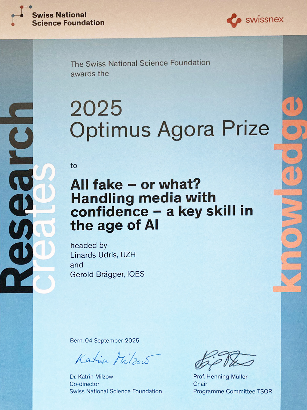 Unser CheckNews-Projekt »All fake – or what? Handling media with confidence – a key skill in the age of AI« hat 2025 einen renommierten Preis gewonnen: den »Prix Optimus Agora« des Schweizerischen Nationalfonds SNF in Zusammenarbeit mit Swissnex. Der Preis unterstützt »herausragende« Projekte, die »einen direkten Dialog zwischen Wissenschaft und Gesellschaft ermöglichen«.