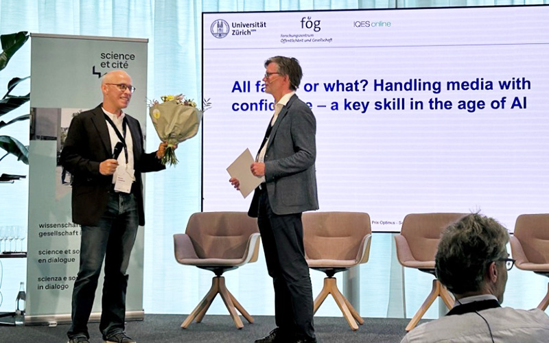 An der ScienceComm25, dem Schweizer Kongress für Wissenschaftskommunikation, durfte Linards Udris den Preis im Namen des Projekt-Teams entgegennehmen: Jens Lucht und Rebekka Rieser (fög, Universität Zürich) und Gerold Brägger und Nicole Steiner (IQES).