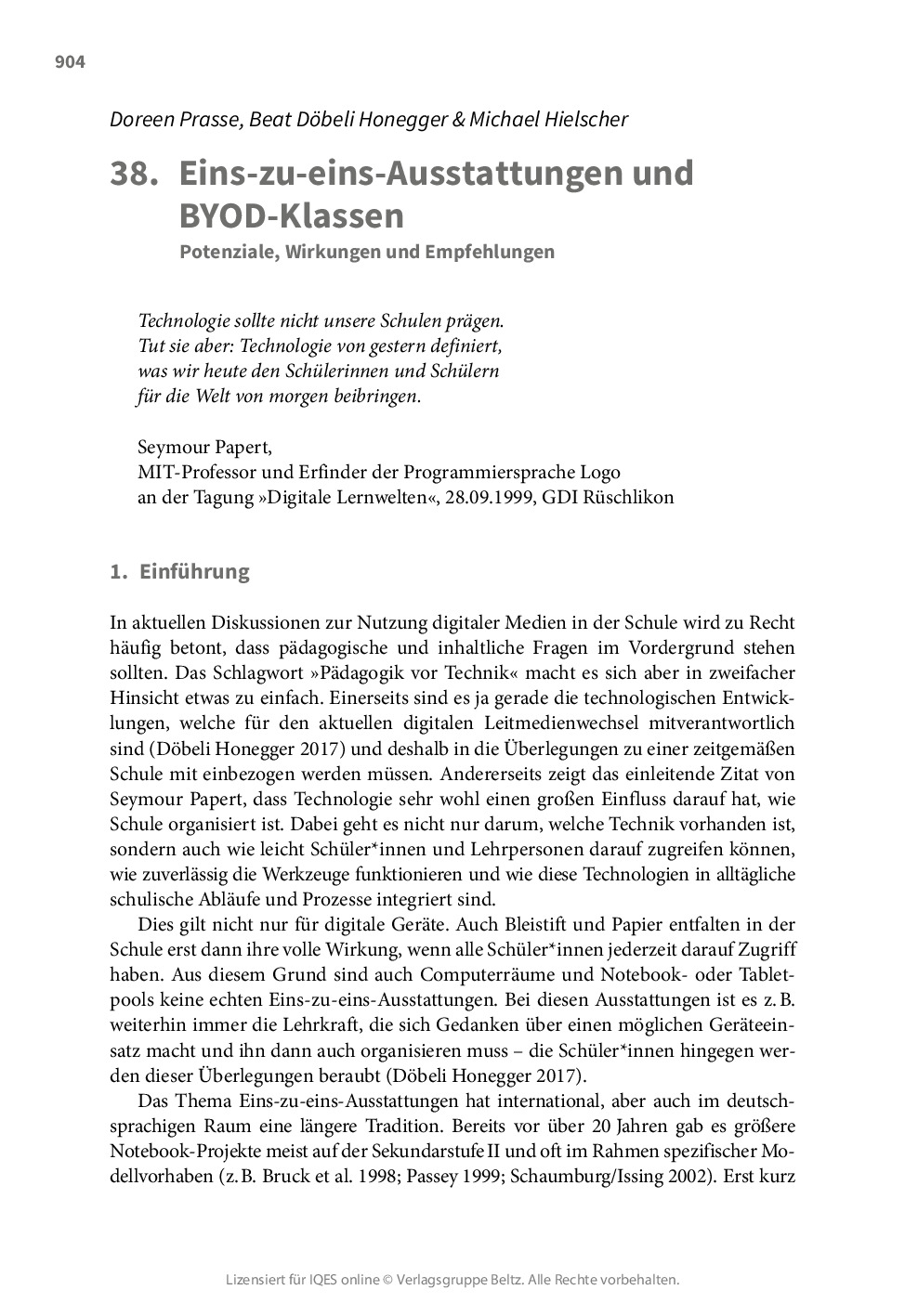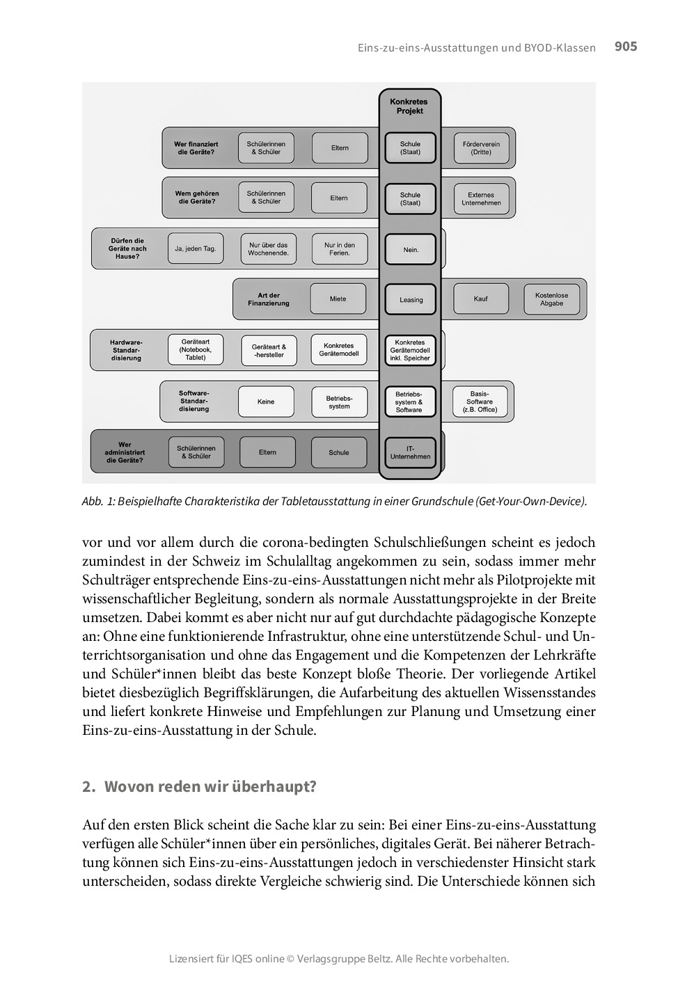 Bei einer Eins-zu-eins-Ausstattung verfügen alle Schüler*innen über ein persönliches, digitales Gerät. Bei näherer Betrachtung können sich Eins-zu-eins-Ausstattungen jedoch in verschiedenster Hinsicht stark unterscheiden. Bei Entscheiden und insbesondere bei der Einführung von Eins-zu-eins-Projekten sollten deshalb immer mindestens folgende Fragen gestellt werden: Was ist das inhaltliche Ziel der Eins-zu-eins-Ausstattung? Welche pädagogischen Chancen und Potenziale bieten mobile, digitale Multifunktionsgeräte? Wie ist die Finanzierung der Eins-zu-eins-Ausstattung geregelt? Was wird standardisiert? Wer administriert die Geräte? Was dürfen Schüler*innen mit ihren persönlichen digitalen Geräten? Wie wirken sich Eins-zu-eins-Ausstattungen in Schule und Unterricht aus? Wie können Eins-zu-eins-Ausstattungen eingeführt werden?