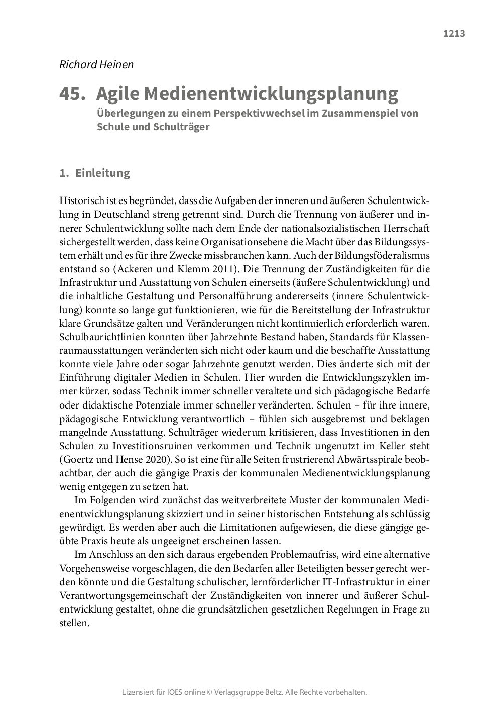 Richard Heinen skizziert in seinem Beitrag zunächst das weitverbreitete Muster der kommunalen Medienentwicklungsplanung in Deutschland. Im Anschluss an die dargelegten Stolpersteine dieser gängigen Praxis schlägt er eine alternative Vorgehensweise vor, die den Bedarfen aller Beteiligten besser gerecht werden könnte: eine agile Medienentwicklung in einem Zusammenspiel zwischen Schulträger, Einzelschulen und regional vernetzten Schulen. Ein vernetztes Vorgehen ermöglicht einen stufenweisen Auf- und Ausbau einer Basisausstattung, die neben der Entwicklung der Technologie ebenso die Qualifizierung des Personal, die Entwicklung von Unterrichtsszenarien und die Weiterentwicklung der gesamten Organisation vorantreibt.