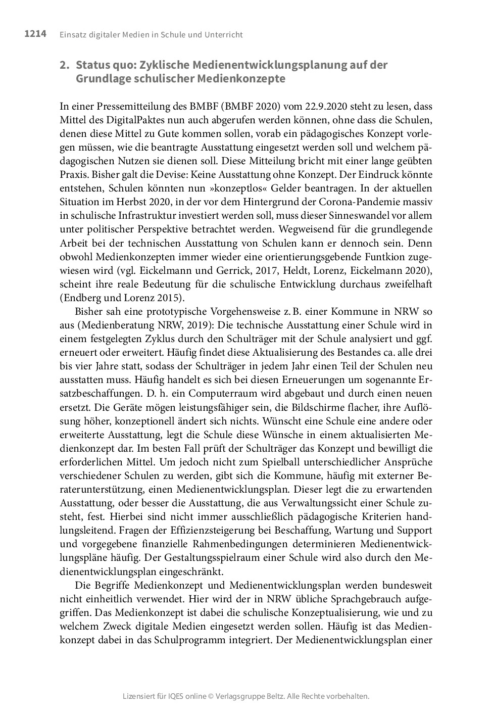 Die Richtlinien von Bundesländern (bzw. Kantonen) sehen vor, dass die Schulen eigene Medienkonzepte erstellen. Diese sollen die Grundlage für den Medienentwicklungsplan des Schulträgers und entsprechende Zuwendungsanträge bilden. Die Erfahrung zeigt, dass die Erarbeitung von Medienkonzepten Zeit braucht und sich an pädagogischen Vorstellungen und Bedürfnissen orientieren sollte.