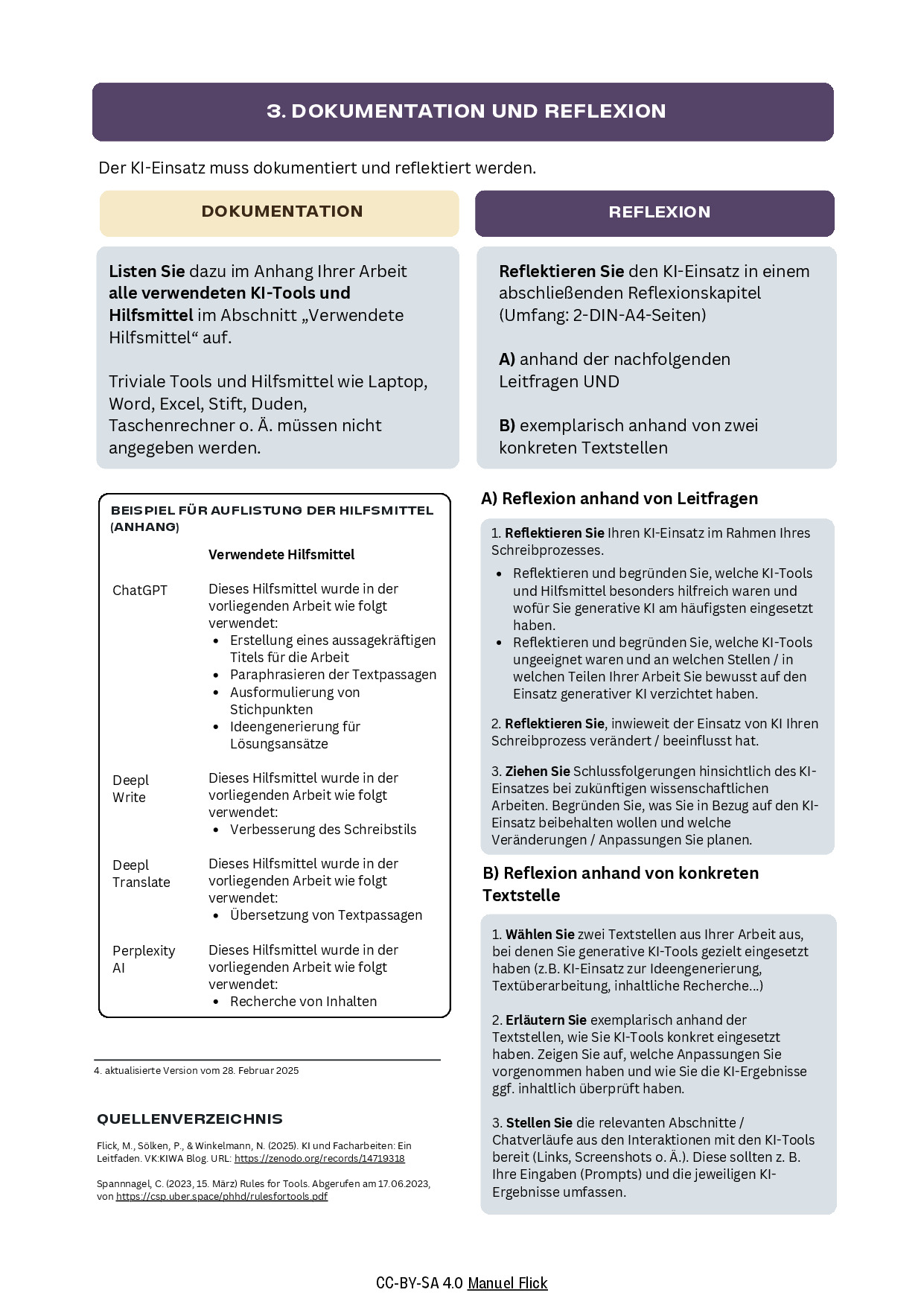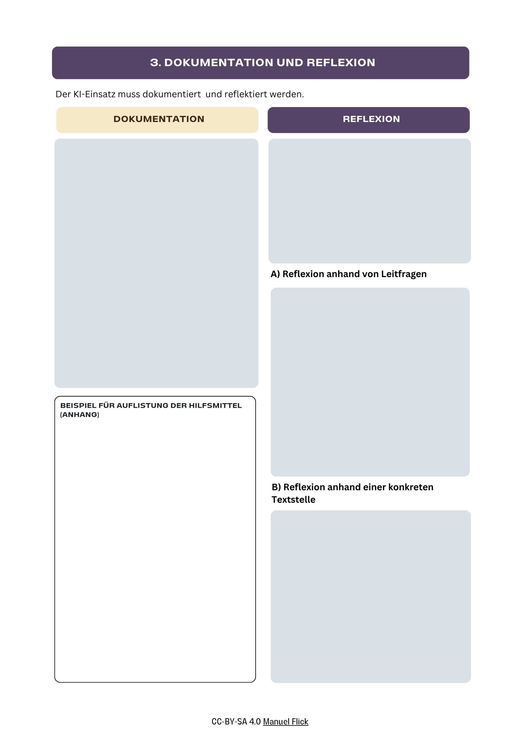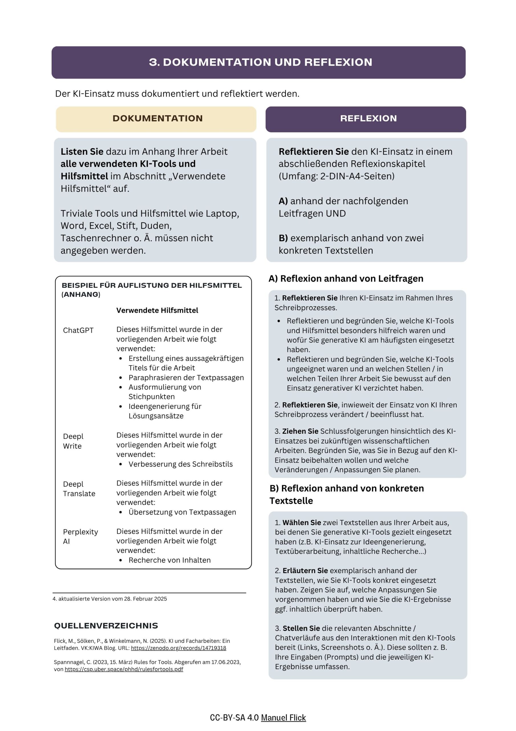 Anstelle einer detaillierten Protokollierung aller KI-Interaktionen rückt die Reflexion des KI-Einsatzes noch stärker in den Fokus. Im Vergleich zu vorangegangenen Versionen der AI Policy findet die Reflexion nun anhand gezielter Leitfragen sowie zusätzlich anhand konkreter Textstellen statt.