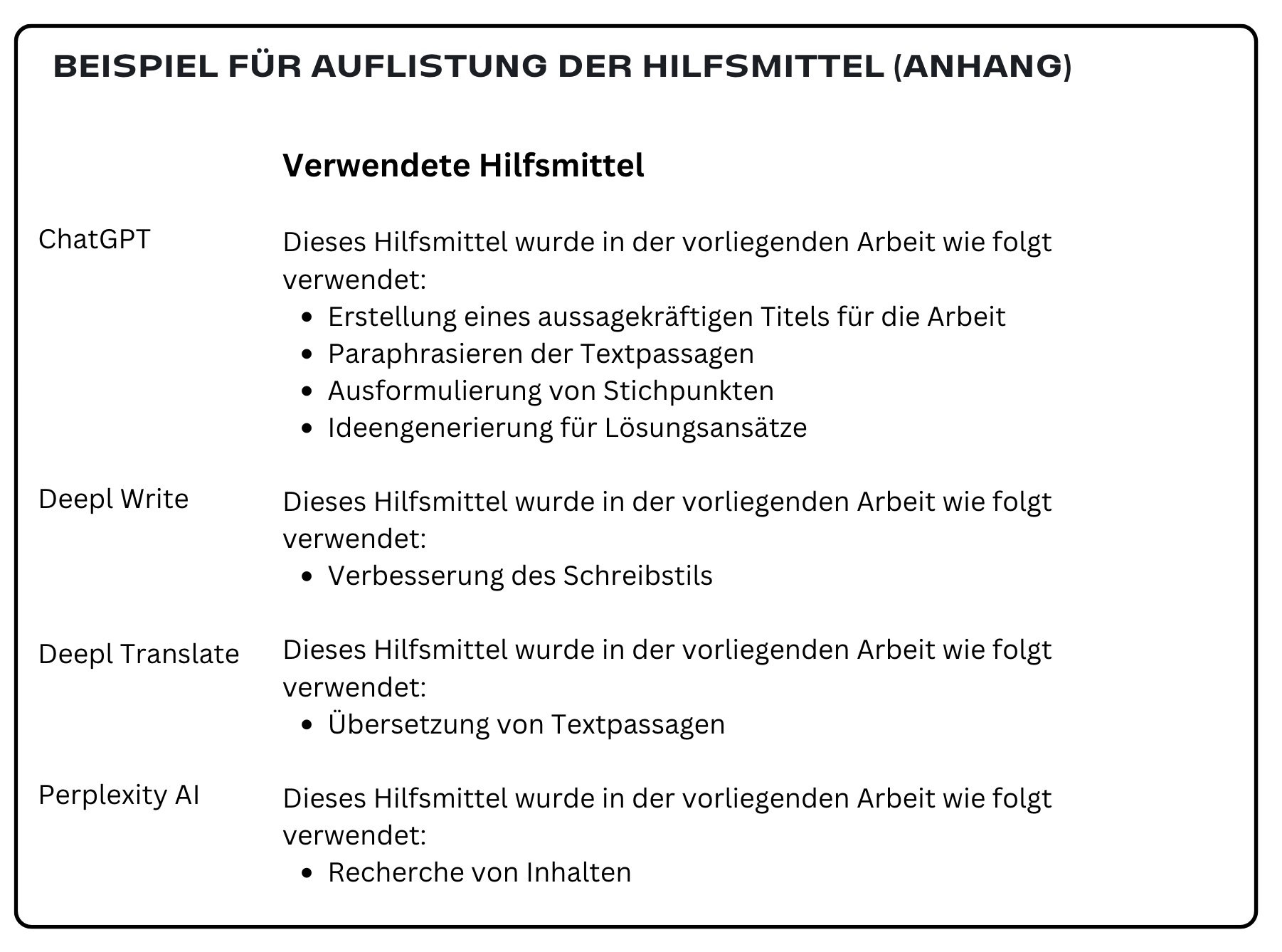 Die Erfahrung aus mittlerweile vier Unterrichtsprojekten und den dazugehörigen Projektarbeiten hat jedoch gezeigt, dass eine akribische Dokumentation des KI-Einsatzes bei wissenschaftlichen Arbeiten weder praxisnah noch zielführend ist.