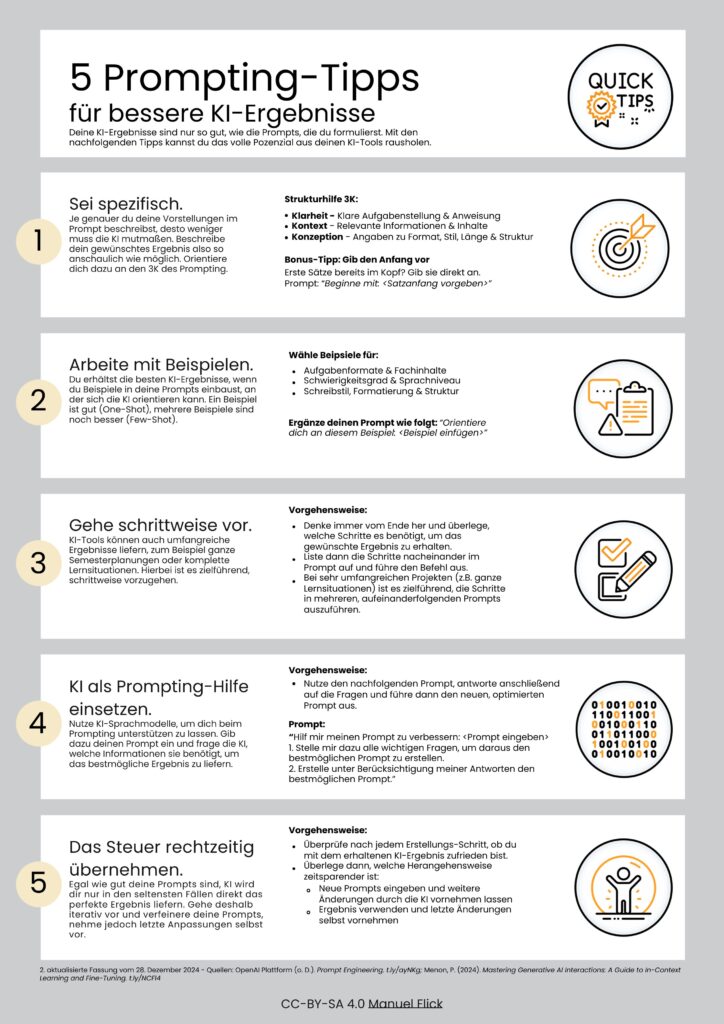 Eure KI-Ergebnisse sind nur so gut wie die Prompts, die ihr formuliert. Mit diesen fünf Tipps könnt ihr mehr aus euren KI-Tools herausholen. Ob ihr spezifische Prompts formuliert, mit Beispielen arbeitet, schrittweise vorgeht, die KI als Prompting-Hilfe nutzt oder rechtzeitig selbst die Kontrolle übernehmt – ihr habt jetzt das Handwerkszeug, um bessere KI-Ergebnisse zu erzielen. Dabei müssen nicht immer alle Tipps auf einmal angewandt, sondern können je nach Aufgabenstellung und Anforderung punktuell eingesetzt werden.