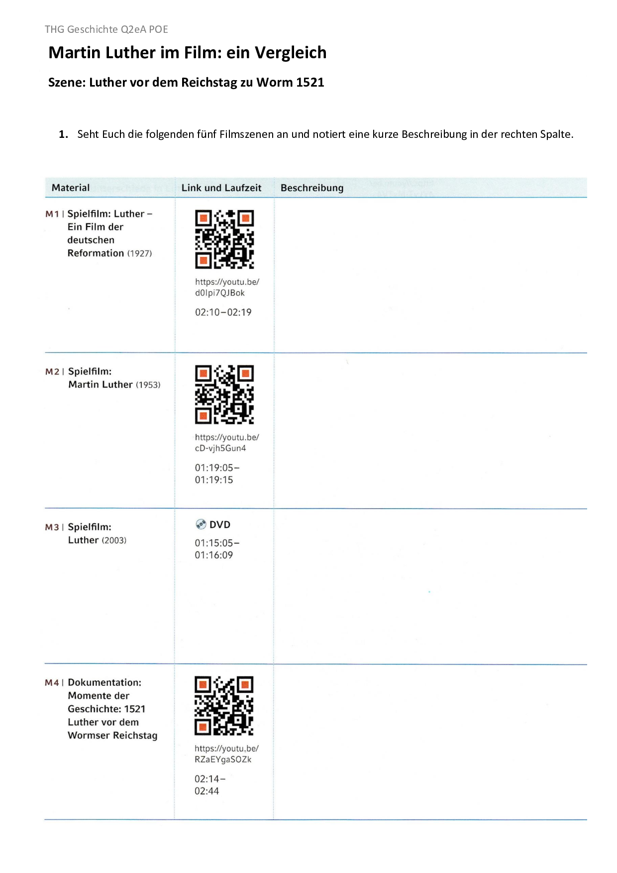 Ein Beispiel für den Einsatz von QR-Codes im Unterricht: Die Schüler vergleichen unterschiedliche Luther-Verfilmungen anhand der Schlüsselszene während des Reichstags zu Worms 1521. Per QR-Code wurden (ansonsten lang und kompliziert einzugebende) Links zu den unterschiedlichen Verfilmungen auf dem Arbeitsblatt hinterlegt.