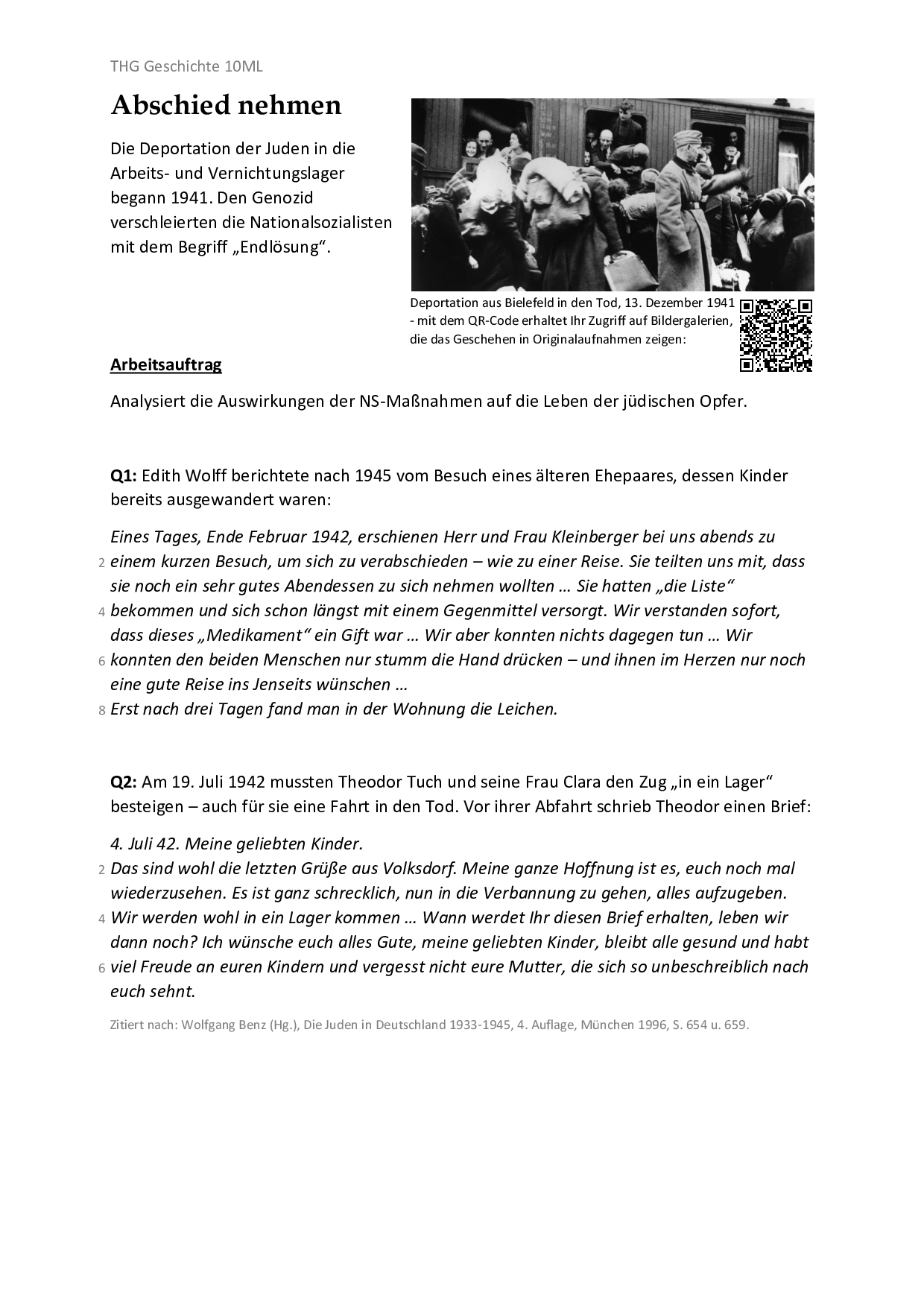 In diesem Arbeitsblatt zur Deportation der jüdischen Mitbürger aus Bielefeld wurde per QR-Code der Link zu einer öffentlich zugänglichen Bildgalerie hinzugefügt.