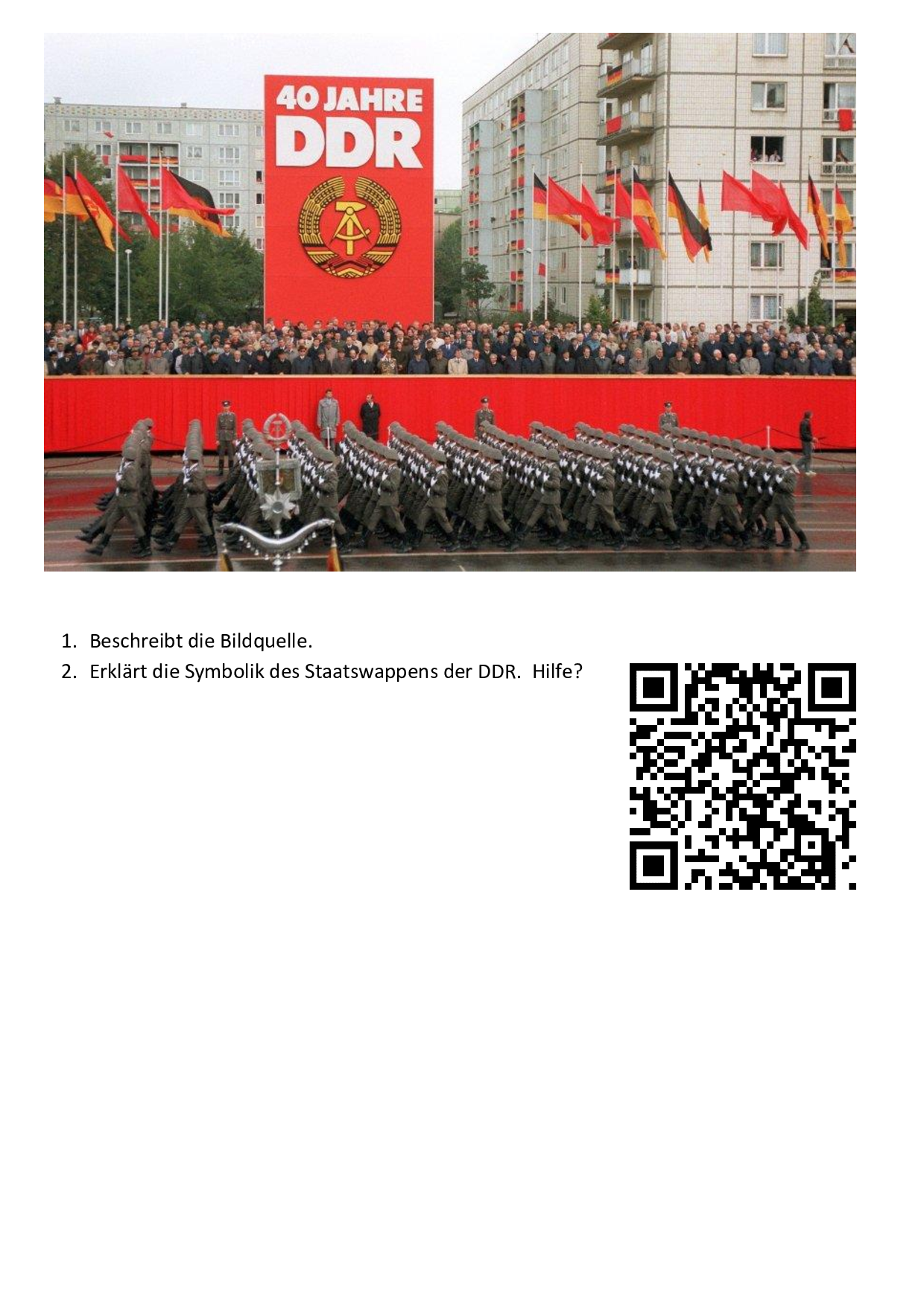 Ein weiteres Beispiel zeigt die Möglichkeit für Schüler, sich schnell bezüglich des Staatswappens der DDR zu informieren, falls die Vorkenntnisse zur Interpretation der zentral am Beamer gezeigten Bildquelle nicht ausreichen. Per QR-Code-Scan gelangen sie zu einer informativen Website mit relevanten Angaben.
