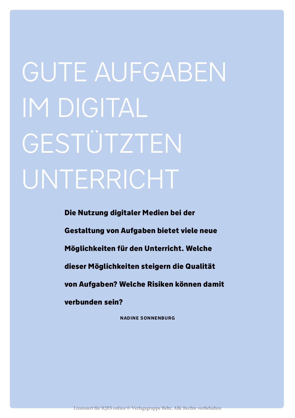 Die Nutzung digitaler Medien bei der Gestaltung von Aufgaben bietet viele neue Möglichkeiten für den Unterricht. Welche dieser Möglichkeiten steigern die Qualität von Aufgaben? Welche Risiken können damit verbunden sein?