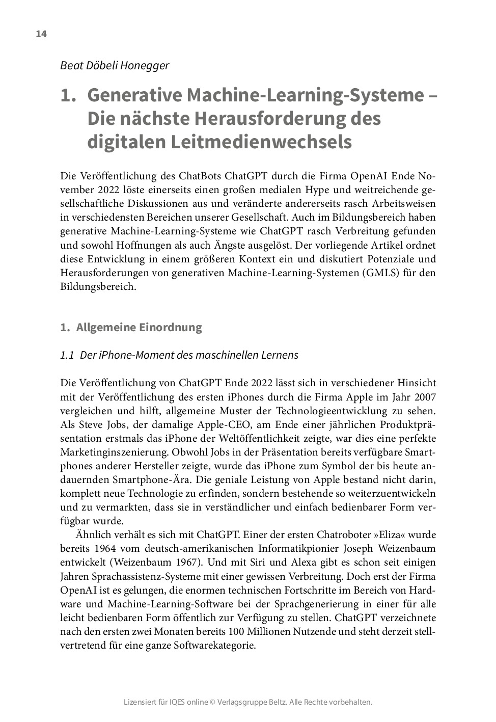 Die Veröffentlichung des ChatBots ChatGPT durch die Firma OpenAI Ende November 2022 löste einerseits einen großen medialen Hype und weitreichende gesellschaftliche Diskussionen aus und veränderte andererseits rasch Arbeitsweisen in verschiedensten Bereichen unserer Gesellschaft. Auch im Bildungsbereich haben generative Machine-Learning-Systeme wie ChatGPT rasch Verbreitung gefunden und sowohl Hoffnungen als auch Ängste ausgelöst. Der vorliegende Artikel ordnet diese Entwicklung in einem größeren Kontext ein und diskutiert Potenziale und Herausforderungen von generativen Machine-Learning-Systemen (GMLS) für den Bildungsbereich.