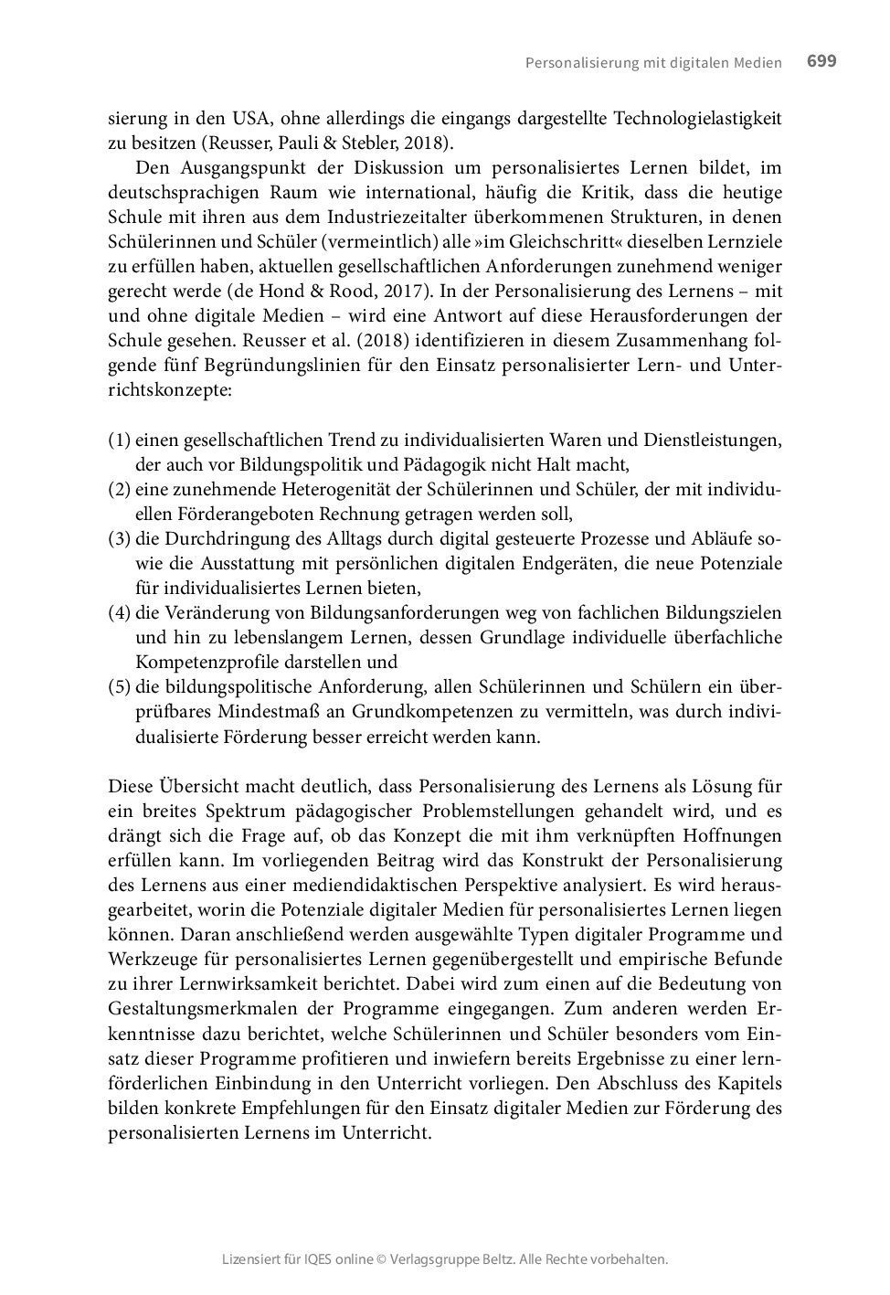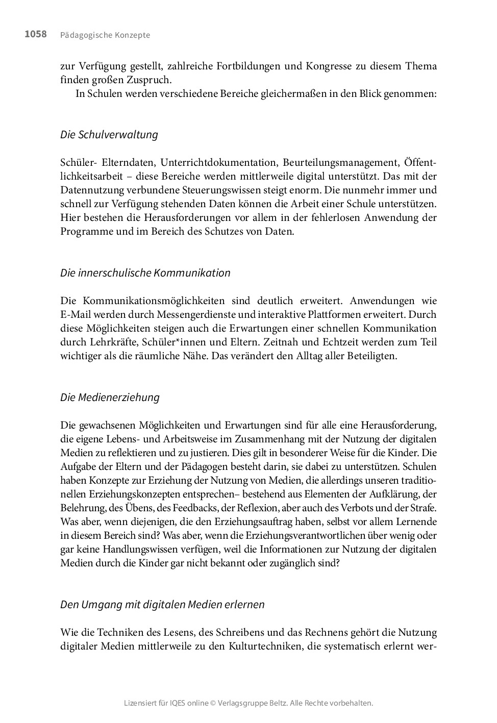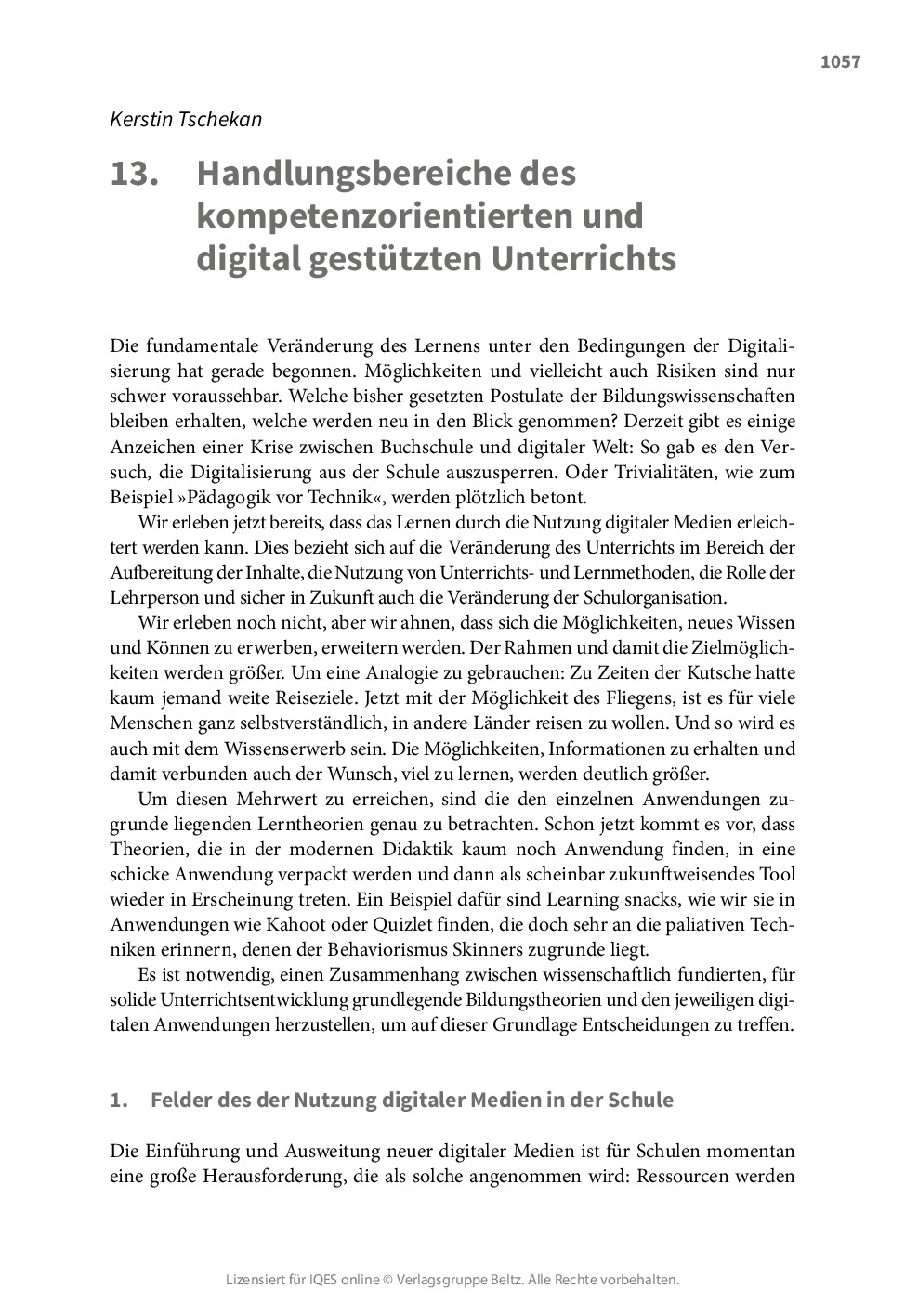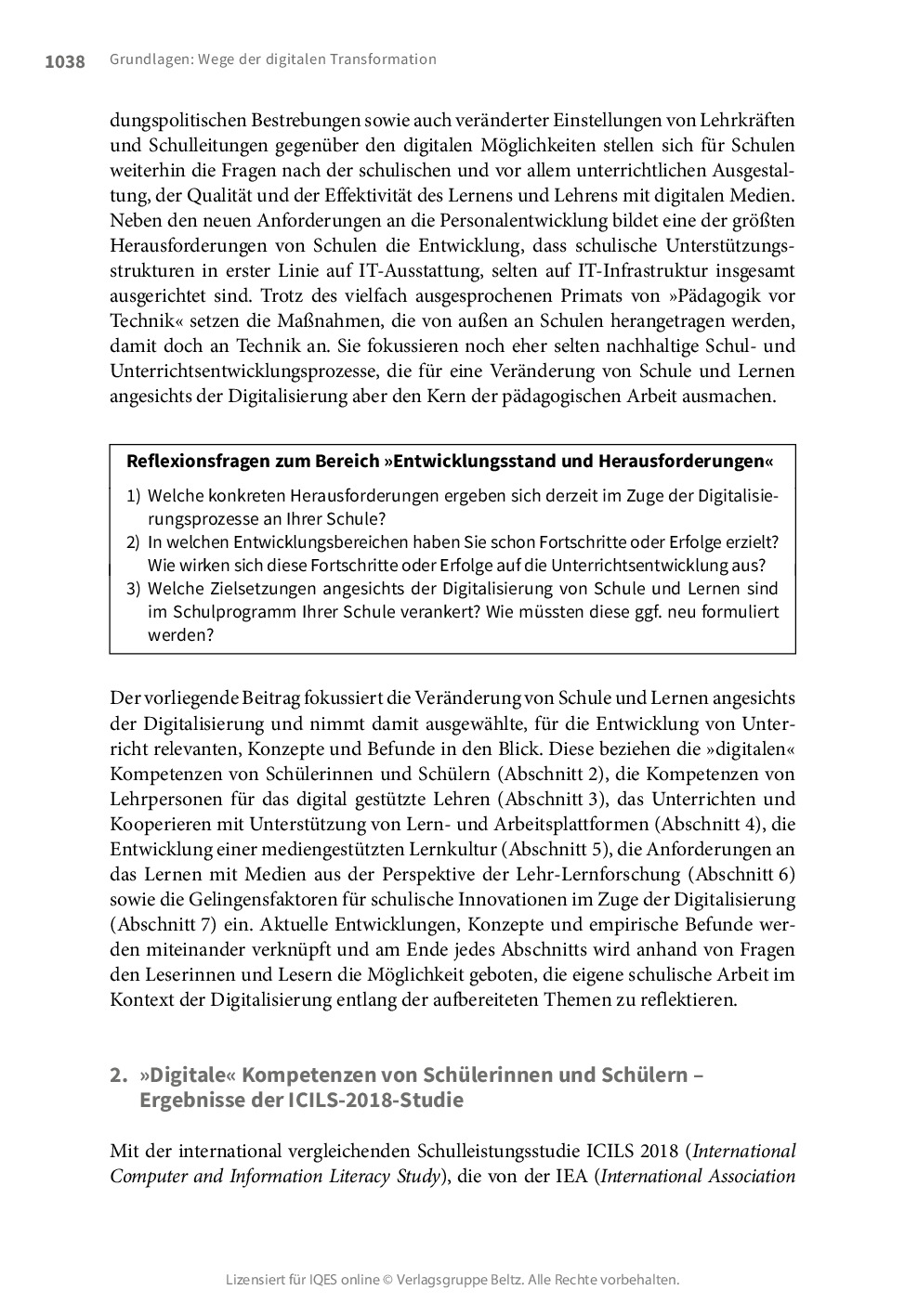 Die gesellschaftlichen Entwicklungen im Zuge der Digitalisierung stellen Schulen und Schulsysteme derzeit vor immer neue Herausforderungen. Während die Erprobung der Möglichkeiten, auch unter Nutzung der Potenziale digitaler Medien für das Lehren und Lernen, international schon seit mehreren Jahrzehnten diskutiert und auch wissenschaftlich untersucht wird, hat das Thema im deutschsprachigen Raum, vor allem in Deutschland, erst vergleichsweise spät an Fahrt aufgenommen. Der Beitrag beschreibt die »digitalen« Kompetenzen von Jugendlichen. Er gibt Antworten auf die Frage, welche Kompetenzen Lehrkräfte bei digital gestütztem Unterrichten brauchen, und er zeigt Perspektiven für die Entwicklung einer mediengestützten Lernkultur.