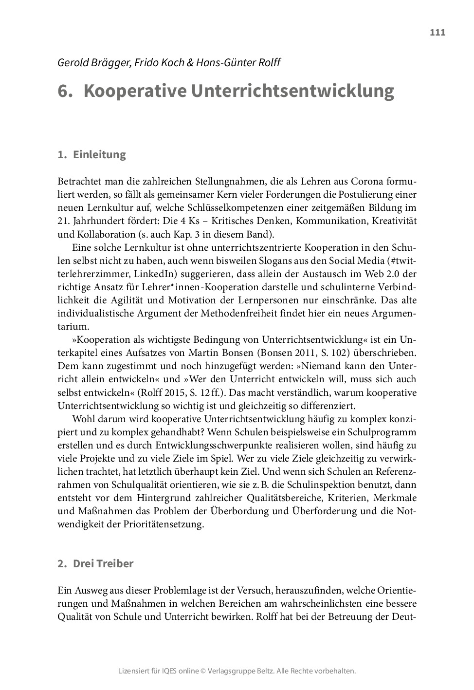 Professionelle Lerngemeinschaften sind ein Schlüssel für eine kompetenzorientierte Schul- und Unterrichtsentwicklung. Dass sie sich an vielen Schulen etabliert haben, hat damit zu tun, dass Lehrer*innen in Teams soziale und fachliche Unterstützung finden, um einen anspruchsvoller gewordenen Beruf mit Freude und Erfolg bewältigen zu können. Die unmittelbar unterrichtsbezogene Kooperation ist so gesehen auch ein zentraler Erfolgsfaktor für schulische Digitalisierungsstrategien. Der Beitrag zeigt, wie gemeinsame Ziele mit Wirkung auf das Lernen gefunden werden können, welche Gefäße für kooperative Unterrichtsentwicklung sich in der Praxis bewährt haben und wie Unterrichtsteams als professionelle Lern- und Arbeitsgemeinschaften erfolgreich zusammenarbeiten können.