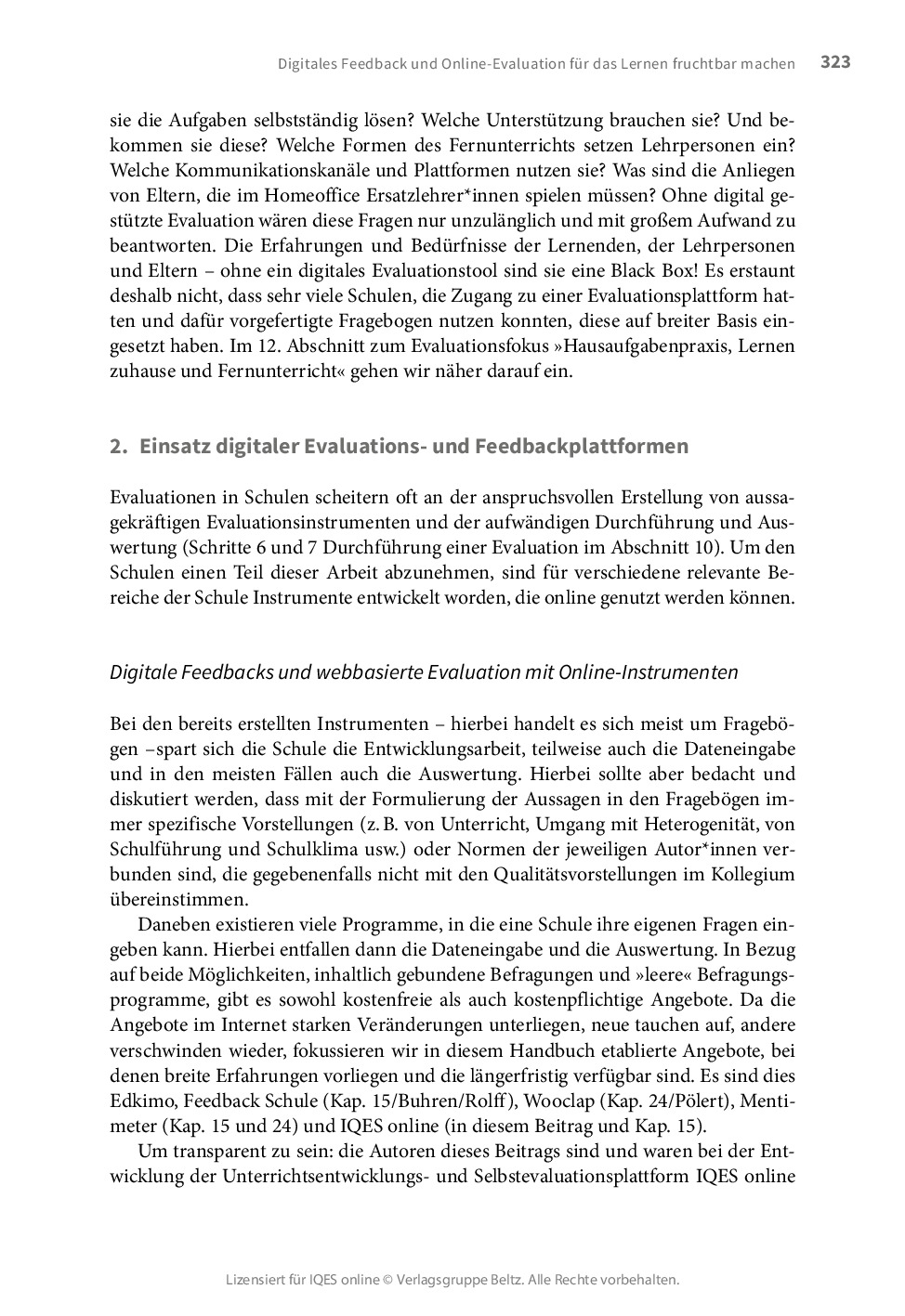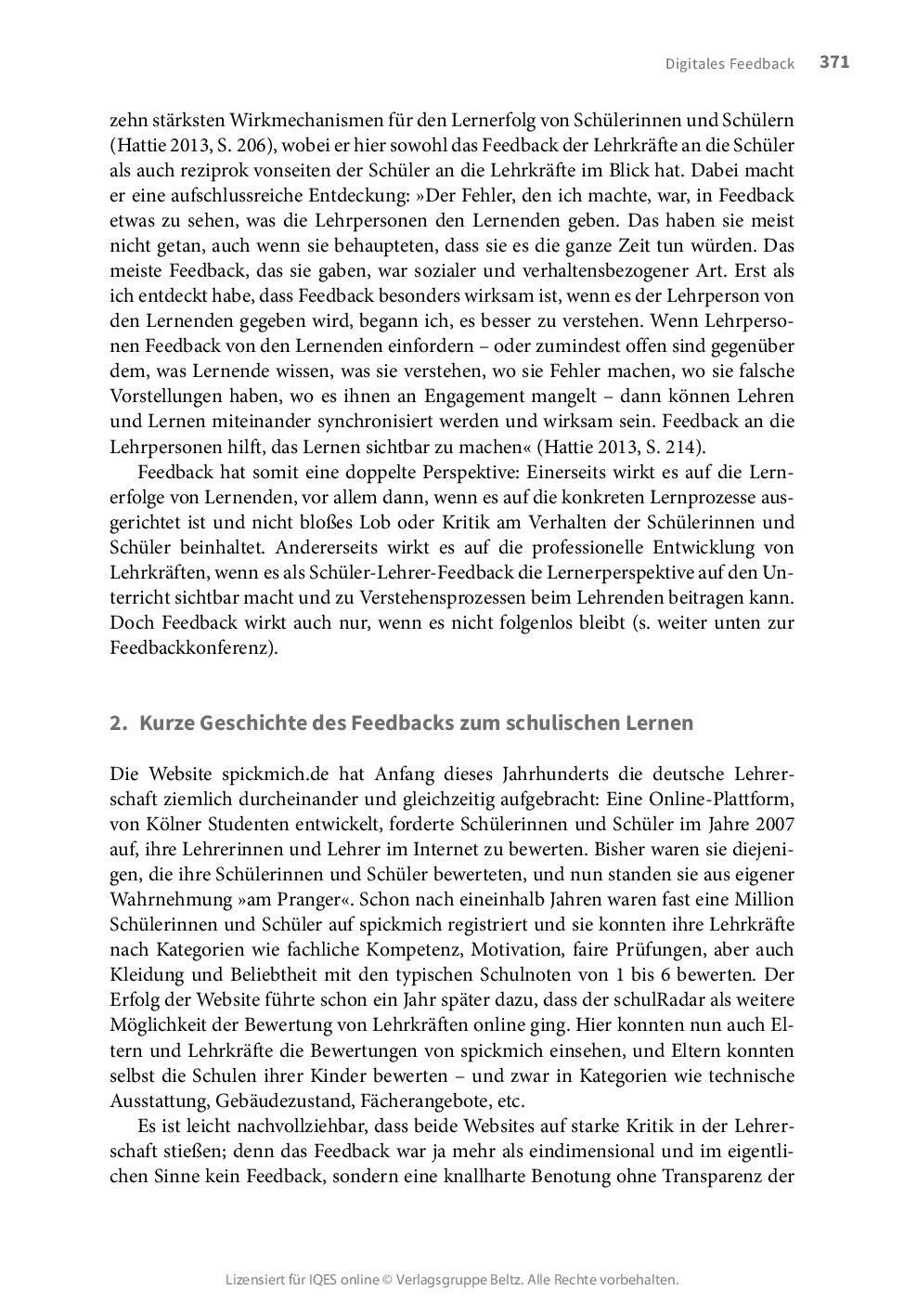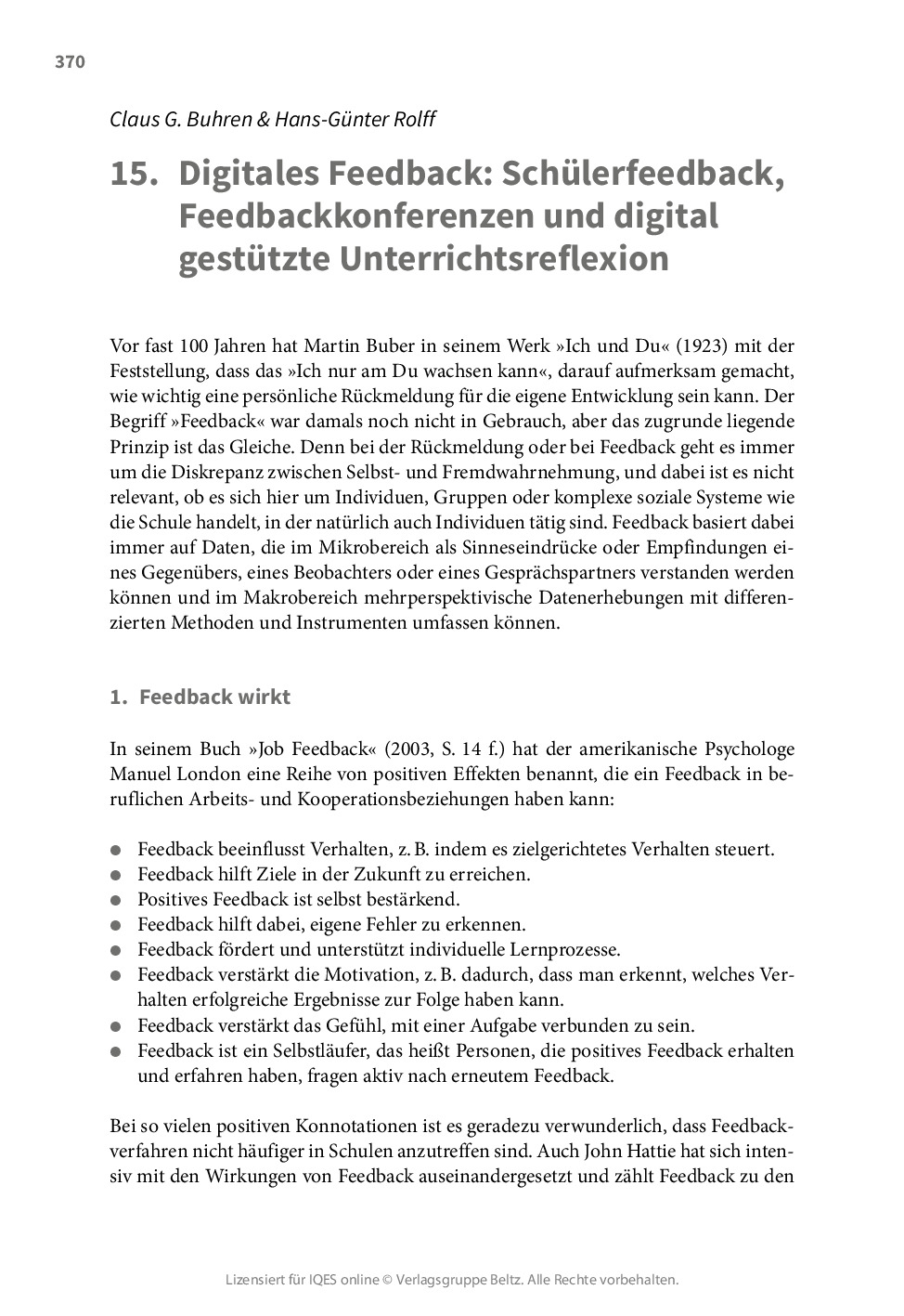 Der Beitrag von Claus Buhren & Hans-Günter Rolff zeigt, dass und wie Feedback wirkt. Er beschreibt verschiedene Feedback-Apps und Online-Plattformen, mit denen ein schnelles und zeitnahes Feedback für die unterschiedlichsten Situationen eingeholt werden kann. Ausserdem illustriert er an Beispielen, wie Feedback-Konferenzen mit Schülerinnen und Schülern oder kollegiales Feedback mit digitalen Medien durchgeführt werden können.