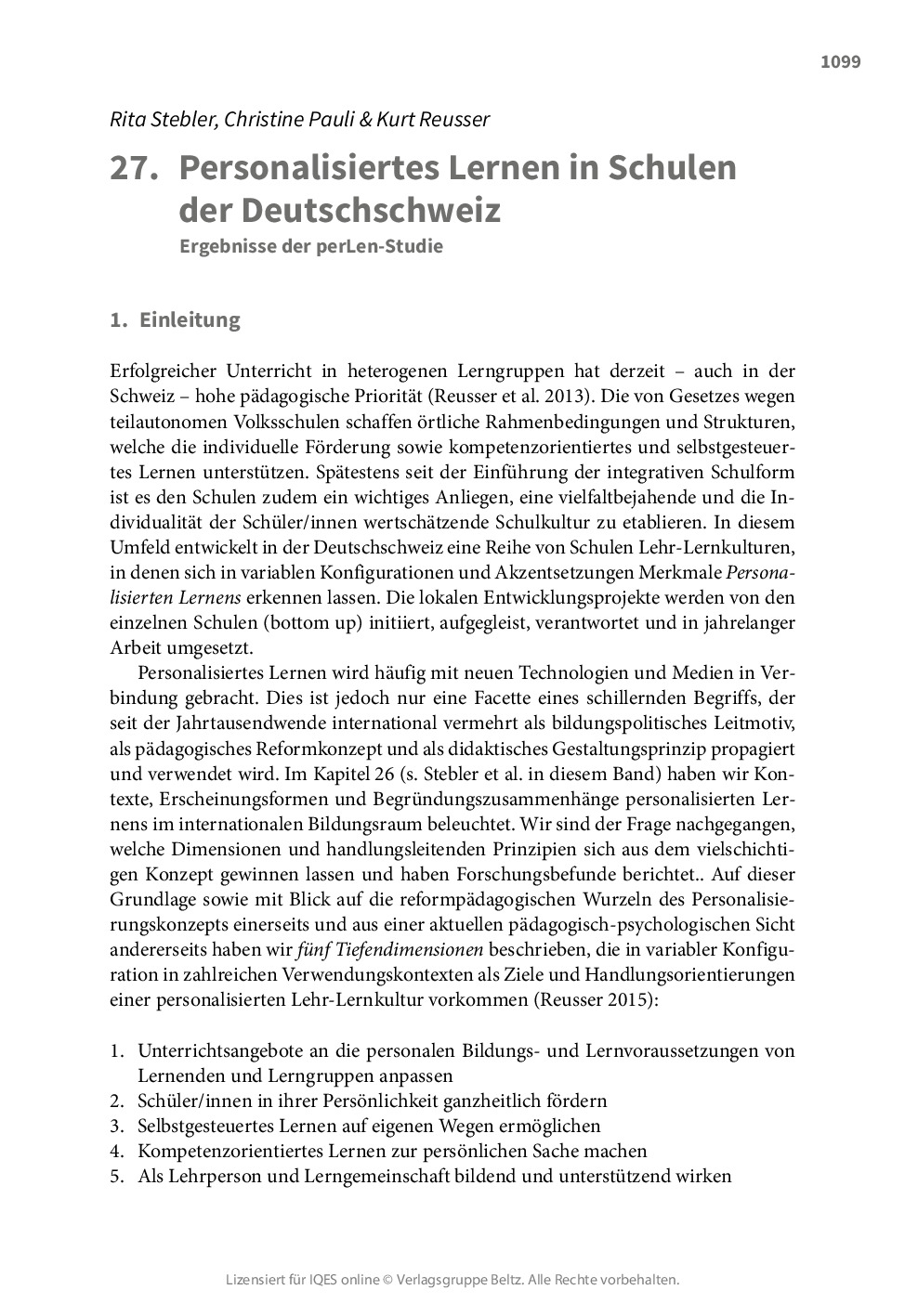 Für Lehrkräfte und Schulleitungen, die sich umfassend mit Fragen der Unterrichts- und Schulentwicklung auseinandersetzen wollen, ist das Handbuch lohnenswert. Das Spektrum der Beiträge reicht von praktischen Ideen zur individuellen (und kooperativen) Unterrichtsgestaltung bis zu wertvollen Leitorientierungen zur Gestaltung systematischer Schulentwicklungsprozesse.
