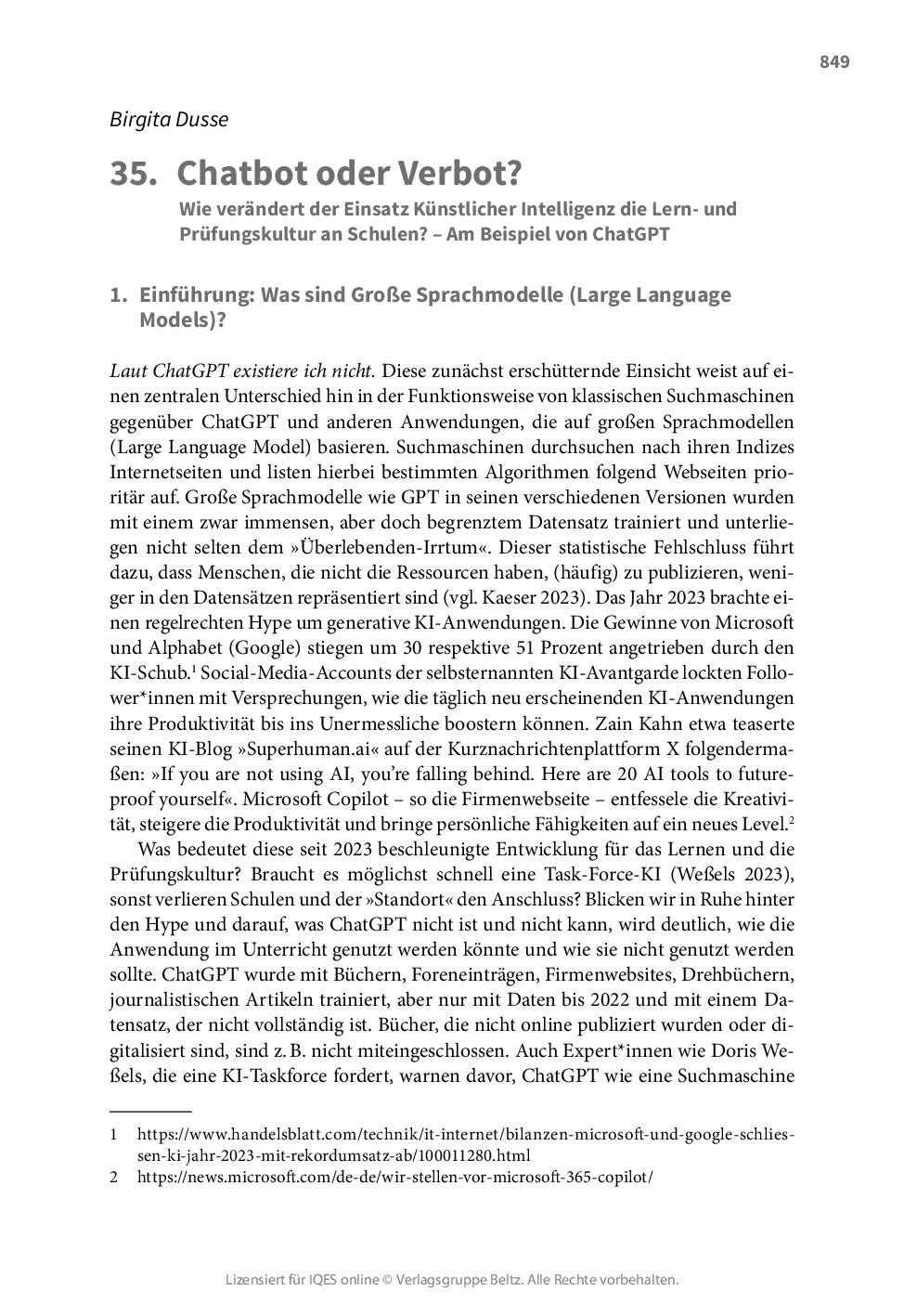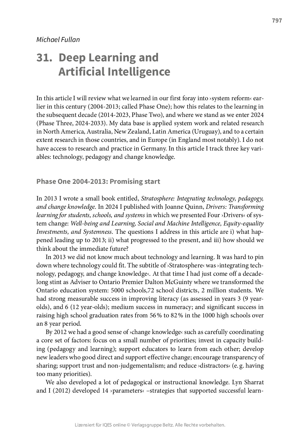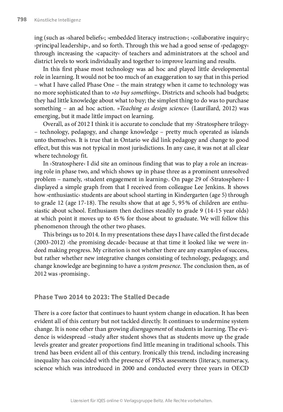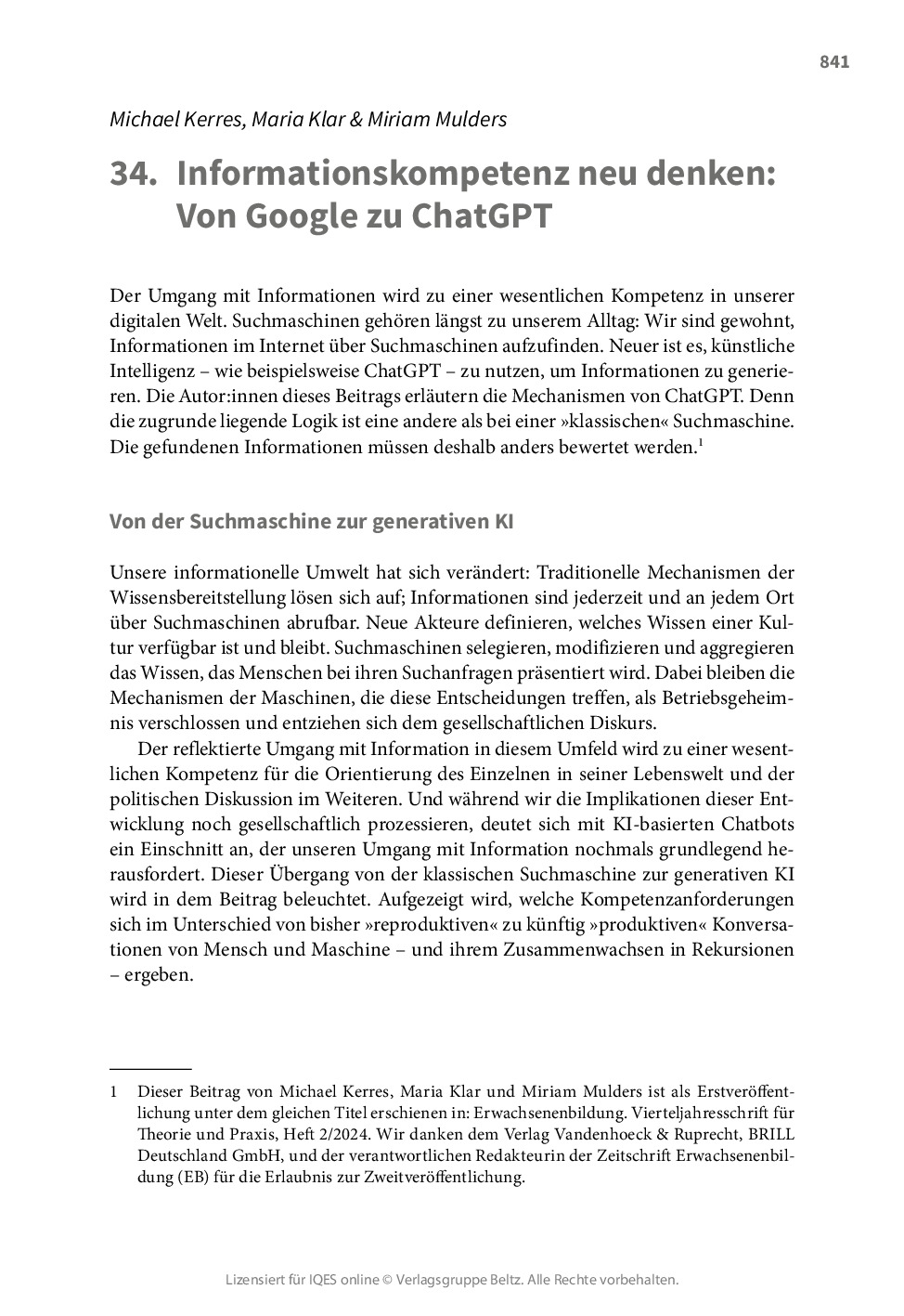 Die Herausforderungen, die sich durch die Zunahme künstlicher Intelligenz im Bildungswesen ergeben, sind riesig. Lehrkräfte, die einst Wissensvermittler waren, sehen sich nun einer Welt gegenüber, in der Wissen ubiquitär und manipulierbar ist. Dies stellt neue Anforderungen an die didaktische Herangehensweise und die Ausbildungscurricula. Die Autoren diskutieren die Notwendigkeit, Schule und Bildung im digitalen Zeitalter neu zu denken, um zukünftige Generationen adäquat vorzubereiten und zu befähigen, mit der Unsicherheit und den Herausforderungen der modernen, digital durchdrungenen Welt umzugehen. Dabei wird die Rolle von Bildungsinstitutionen hervorgehoben, die zwischen alten Strukturen und neuen Anforderungen vermitteln müssen. Der Beitrag plädiert für eine tiefgreifende Transformation des Bildungssystems, um es zukunftsfähig zu machen und die Potenziale der Digitalisierung sinnvoll zu nutzen.