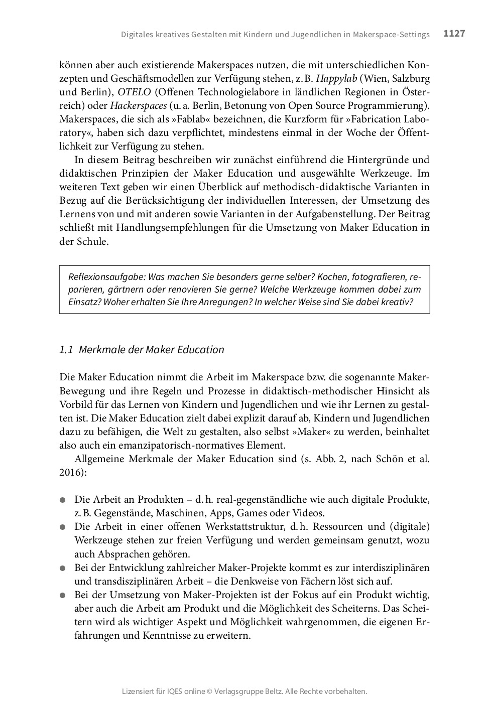 Eine besondere Variante der Nutzung digitaler Technologien an Schulen stellt die sogenannte »Maker Education« dar. Darunter werden Lern- bzw. Lehrsettings verstanden, in denen Merkmale des sogenannten »Making« und der Maker-Bewegung umgesetzt werden. »Making« bezieht sich dabei auf die Betonung des Selbermachens, des handwerklichen und digitalen kreativen Gestaltens und steht damit in der Tradition reformpädagogischer Ansätze, die das »Lernen durch Tun« favorisieren. In diesem Beitrag beschreiben die Autor*innen die Hintergründe und didaktischen Prinzipien der Maker Education und ausgewählte Werkzeuge. Im weiteren Text geben sie einen Überblick auf methodisch-didaktische Varianten. Der Beitrag schließt mit Handlungsempfehlungen für die Umsetzung von Maker Education in der Schule.