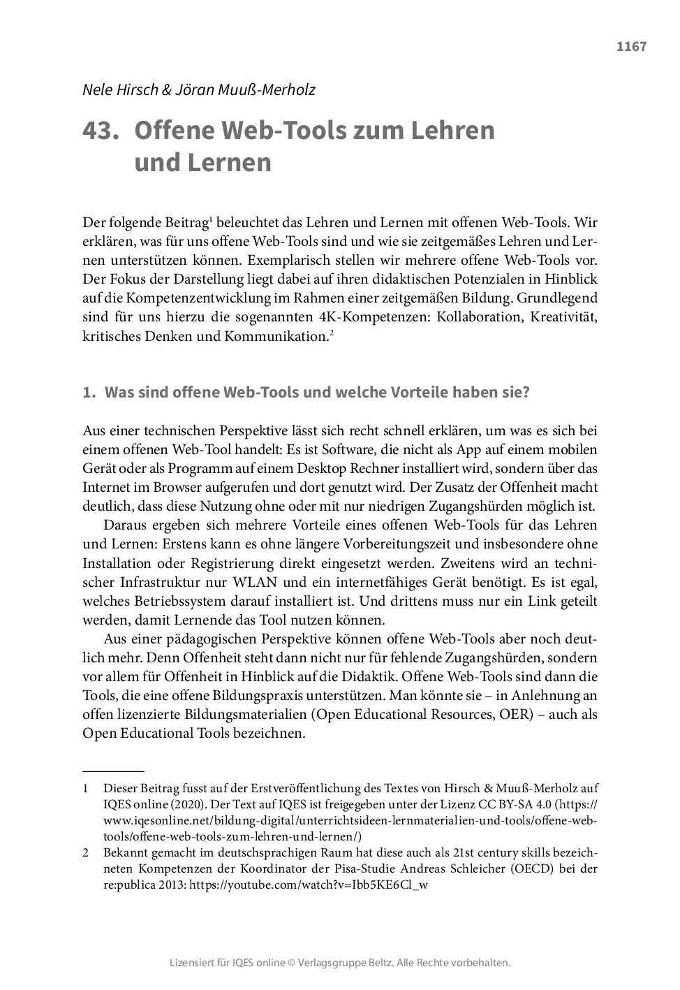 Der Beitrag beleuchtet das Lehren und Lernen mit offenen Web-Tools. Dabei erklären Nele Hirsch und Jöran Muuß-Merholz, was offene Web-Tools sind und wie sie zeitgemäßes Lehren und Lernen unterstützen können. Exemplarisch stellen sie mehrere offene Web-Tools vor. Der Fokus der Darstellung liegt dabei auf ihren didaktischen Potenzialen in Hinblick auf die Kompetenzentwicklung im Rahmen einer zeitgemäßen Bildung. Grundlegend sind für uns hierzu die sogenannten 4K-Kompetenzen: Kollaboration, Kreativität, kritisches Denken und Kommunikation. Offene Web-Tools können über das Internet im Browser einfach aufgerufen und dort frei genutzt wird. Offenheit steht jedoch nicht nur für fehlende technische Zugangshürden, sondern vor allem für Offenheit in Hinblick auf die Didaktik. Offene Web-Tools sind Tools, die eine offene Bildungspraxis unterstützen und für handelndes und interaktives Lernprozesse eingesetzt werden können: zum Beispiel für kollaboratives Schreiben, für das Sammeln von Fragen und Ideen, für das Erkunden oder das offene Lernen in persönlichen Lernumgebungen.