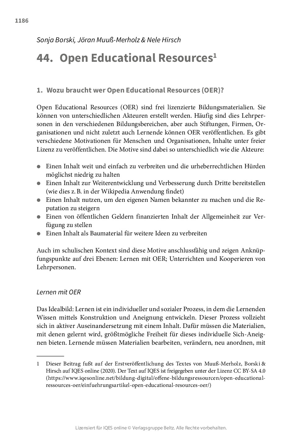 Open Educational Resources (OER) sind frei lizenzierte Bildungsmaterialien. Sie können von unterschiedlichen Akteuren erstellt werden. Häufig sind dies Lehrpersonen in den verschiedenen Bildungsbereichen, aber auch Stiftungen, Firmen, Organisationen und nicht zuletzt auch Lernende können OER veröffentlichen. Freie Lizenzen sind das Rückgrat von offenen und freien Inhalten. In diesem Beitrag beantworten Sonja Borski, Jöran Muuß-Merholz und Nele Hirsch, Pionier*innen der OER-Community, die Fragen: Wozu braucht wer Open Educational Resources (OER)? Was steht hinter der Idee offener Bildungsressourcen? Welche Nutzungsrechte gibt es? Wie hilft mir das kleine Einmaleins der Creative Commons-Lizenzen beim Suchen und Finden, beim Einsetzen und Remixen von Unterrichtsmaterialien? Wie können OER zu Medienkompetenz und zeitgemäßem Unterricht beitragen?