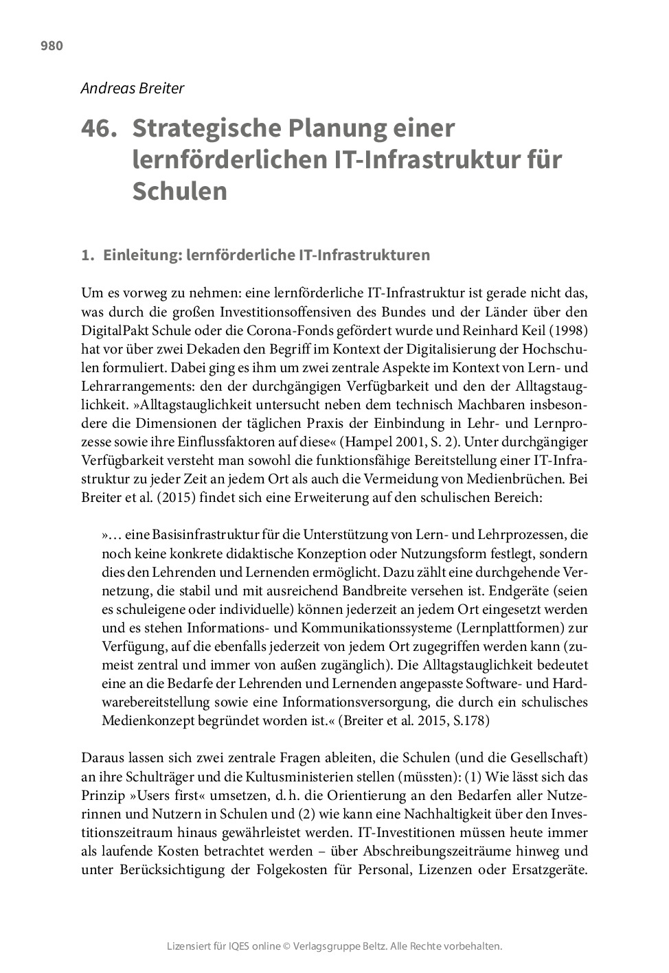 Eines der aktuell umfangreichsten Handbücher zur Unterrichts- und Schulentwicklung in der digitalen Welt wird von Gerold Brägger und Hans Gunter Rolff unter dem Titel Handbuch Lernen mit digitalen Medien herausgegeben. In insgesamt 36 Beiträgen bietet der Band auf 973 Textseiten vielfältige Antworten auf die Frage, wie die Gestaltung von Unterricht mit digitalen Medien erfolgen kann. Das Handbuch vereint dafür u. a. Perspektiven der praktischen und wissenschaftlichen Schulentwicklung, der Medienpädagogik und der Bildungswissenschaften. Durch die Aufteilung der Beiträge in sechs Themenblöcke wird eine nachvollziehbare Struktur geboten. Zu Beginn des Buches werden grundlegende Fragen des Lernens in Zeiten der Digitalisierung (Teil 1) thematisiert, beispielsweise zu den sich wandelnden Rahmenbedingungen der Kindheit und der Schulentwicklung im Kontext der Digitalisierung. Die weiteren Teile des Buches widmen sich pädagogischen Konzepten zur Entwicklung einer kompetenzorientierten und mediengestützten Lernkultur (Teil 2), dem personalisierten Lernen und den Potenzialen von Learning Analytics, das heißt der Nutzung von Daten zur Unterstützung der Lernenden (Teil 3), dem Einsatz digitaler Medien in Schule und Unterricht (Teil 4) sowie der Gestaltung kompetenzorientierter Lernprozesse (Teil 5). Zum Abschluss formulieren die Herausgeber im sechsten Teil des Buches ein Fazit und verdichten die Vielzahl an Beiträgen zu 20 Leitorientierungen.
