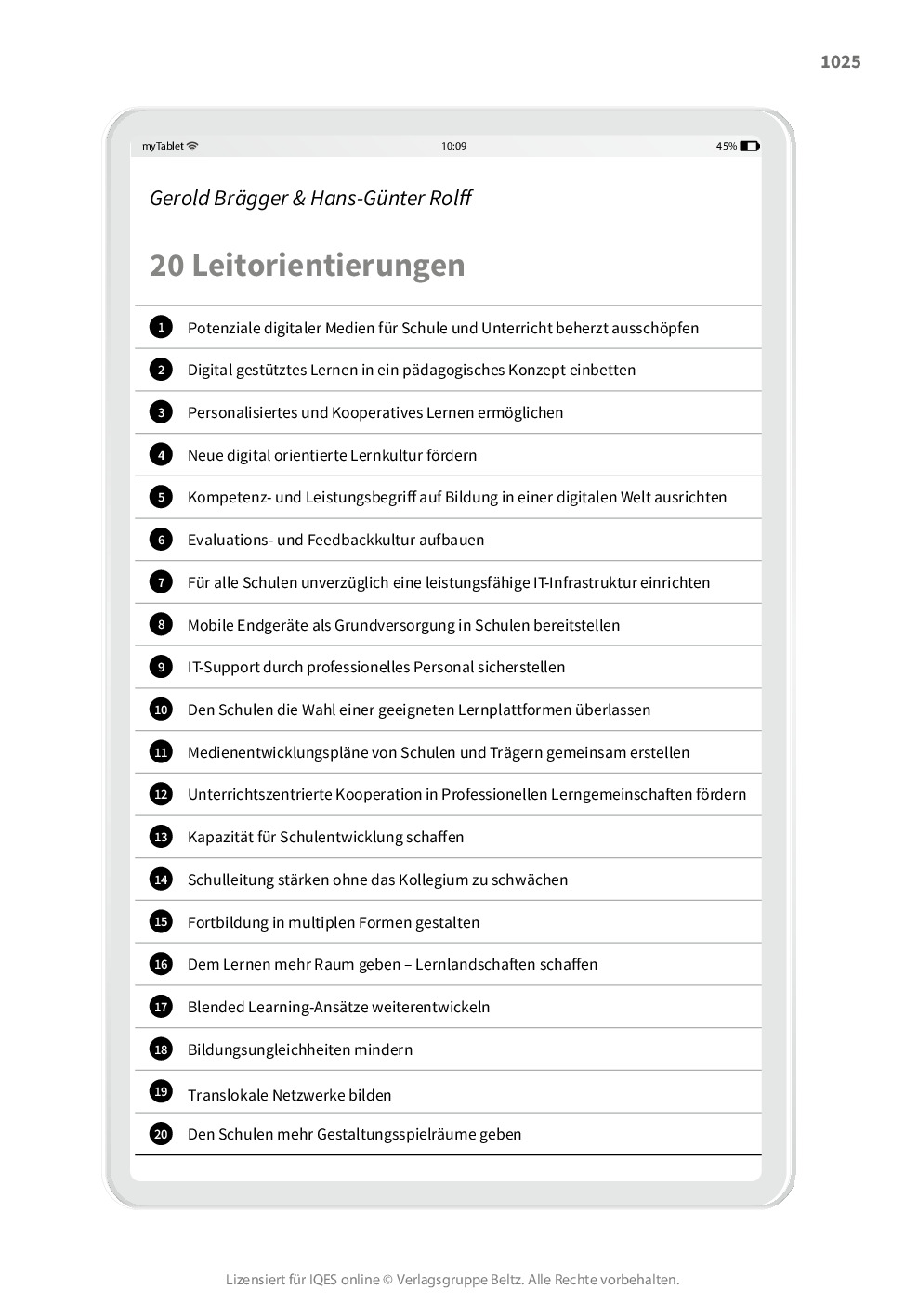 Zwanzig Leitorientierungen: von der »Einbettung in pädagogische Konzepte« und der »Förderung neuer digital orientierten Lernkulturen« über »notwendige IT-Ausstattung« und »Kapazität für Schulentwicklung« bis zu »translokalen Netzwerken« und »vermehrten Gestaltungsspielräumen«.