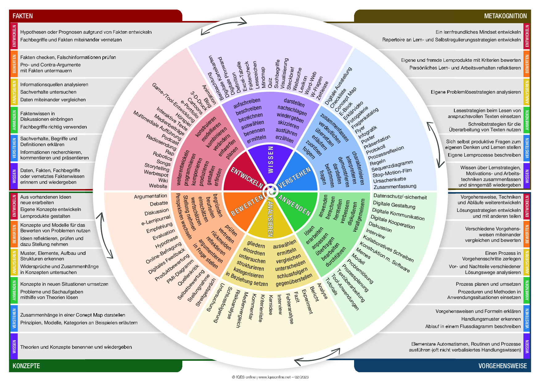 Das Kompetenzrad für das Lernen mit digitalen Medien ist das Pendent zum allgemeinem IQES-Kompetenzrad. Während dieses ermöglicht, differenzierende Aufgaben für analoge und digitale Lernprodukte zu gestalten, zeigt das »Kompetenzrad digital«, welche Kompetenzen Lernende mit digitalen Medien erwerben können. Für die Formulierung von Aufgaben und Lernzielen bieten sich Verben an, die aktives Medienhandeln auf den 6 Stufen des Wissens und Könnens unterstützen. Digitale Lernprodukte und Handlungsproben dienen in einem solchen handlungsorientierten Unterricht als Kompetenznachweise.
