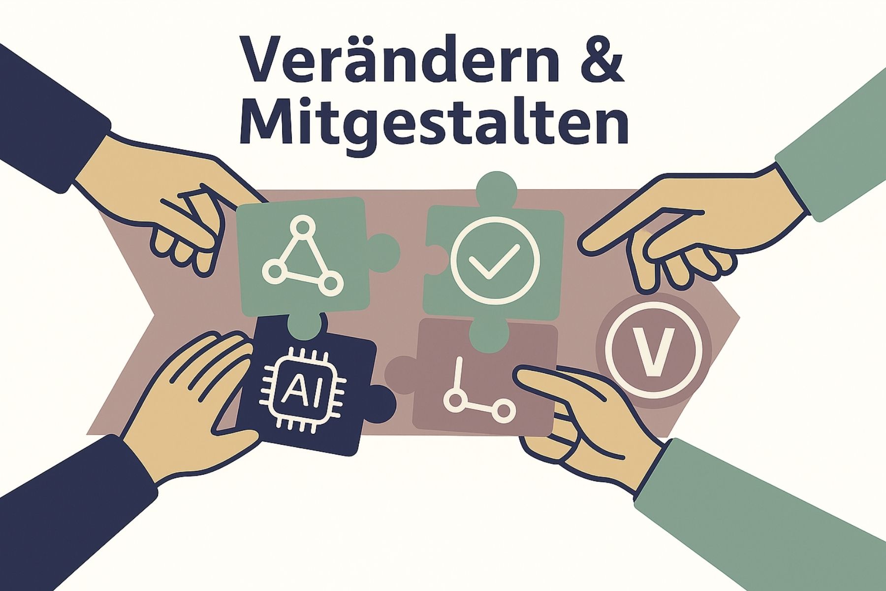 V – Verändern & Mitgestalten: Das Kollegium gestaltet die schulische Zukunft mit KI aktiv mit. Die Schulentwicklung unterstützt diesen Prozess gezielt, indem sie KI-/Projektgruppen stärkt, weitere Multiplikator:innen aufbaut, Ergebnisse sichtbar macht, Erfolge würdigt und erarbeitete Standards im Schulprogramm und Leitbild verankert.