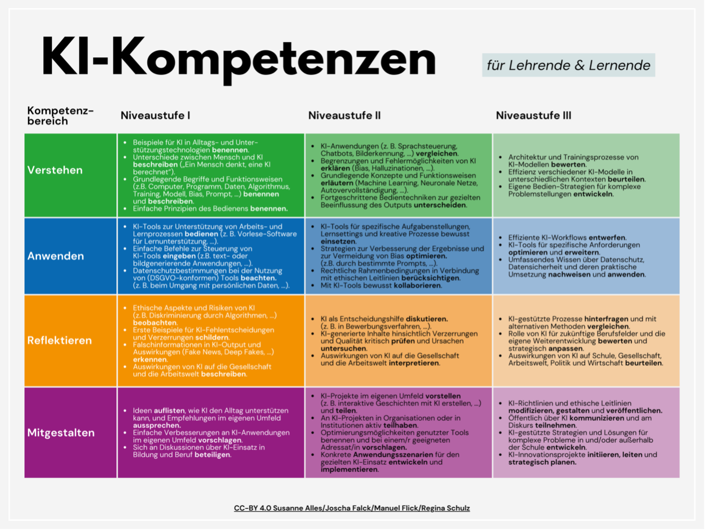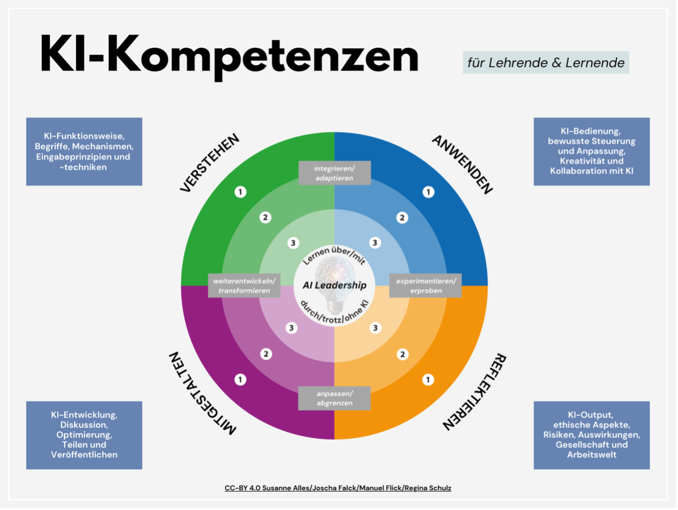 Alles, S., Falck, J., Flick, M., & Schulz, R. (2025, 13. März). KI‑Kompetenzen für Lehrende und Lernende: Aus der Praxis für die Praxis – eine adaptierbare Basis [PDF]. Virtuelles Kompetenzzentrum – Schreiben lehren und lernen mit Künstlicher Intelligenz (VK:KIWA).