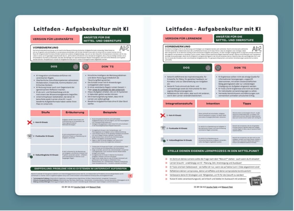Der Leitfaden „Aufgabenkultur und KI”, den Joscha Falck und ich gemeinsam entwickelt haben, bildet einen guten Startpunkt, um eine KI-resilientere sowie KI-integrierende Aufgabenkultur im Unterricht zu etablieren. Im Leitfaden wird zwischen Aufgabenformaten ohne KI-Einsatz, mit punktuellem und vollumfänglichem KI-Einsatz unterschieden.