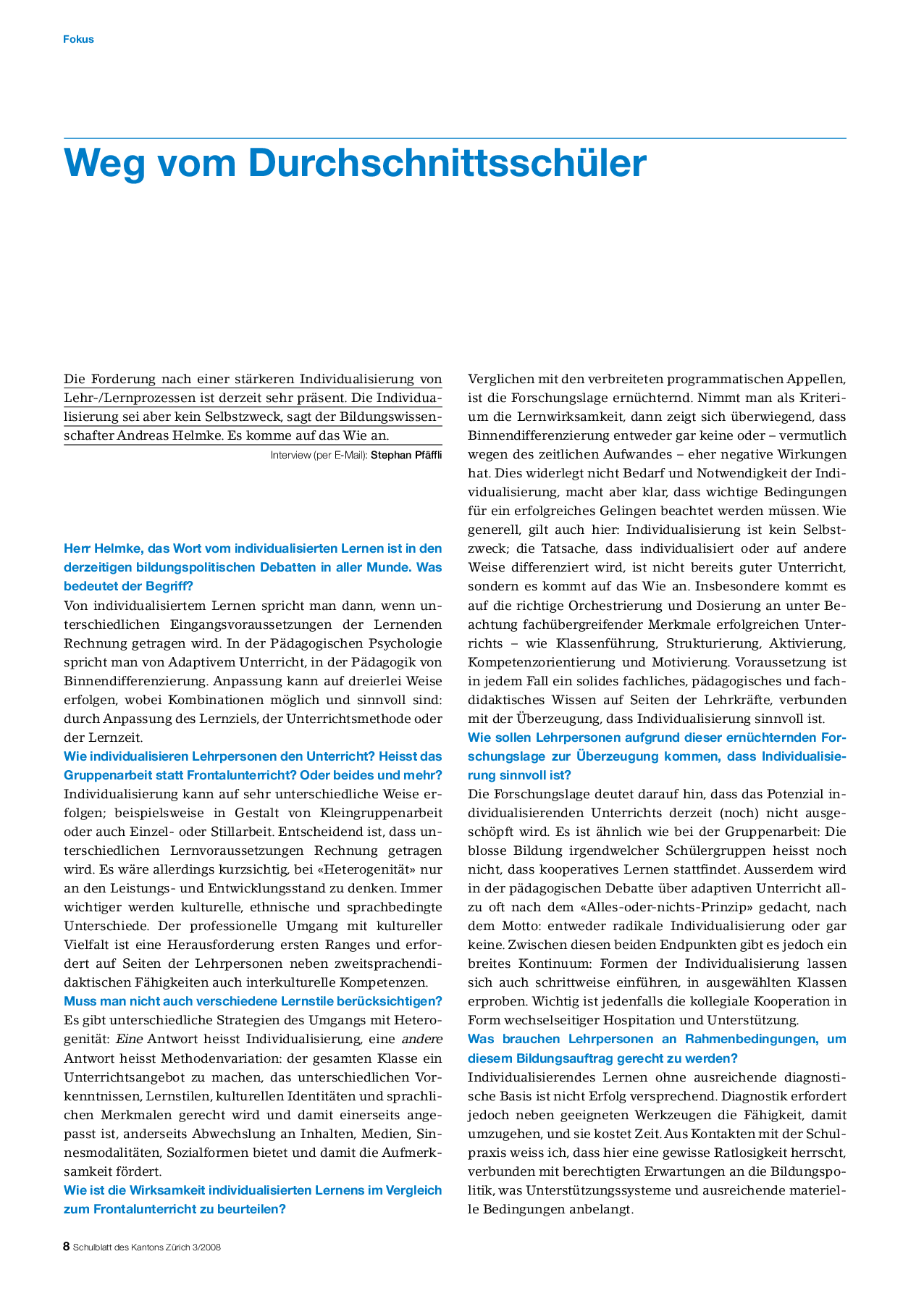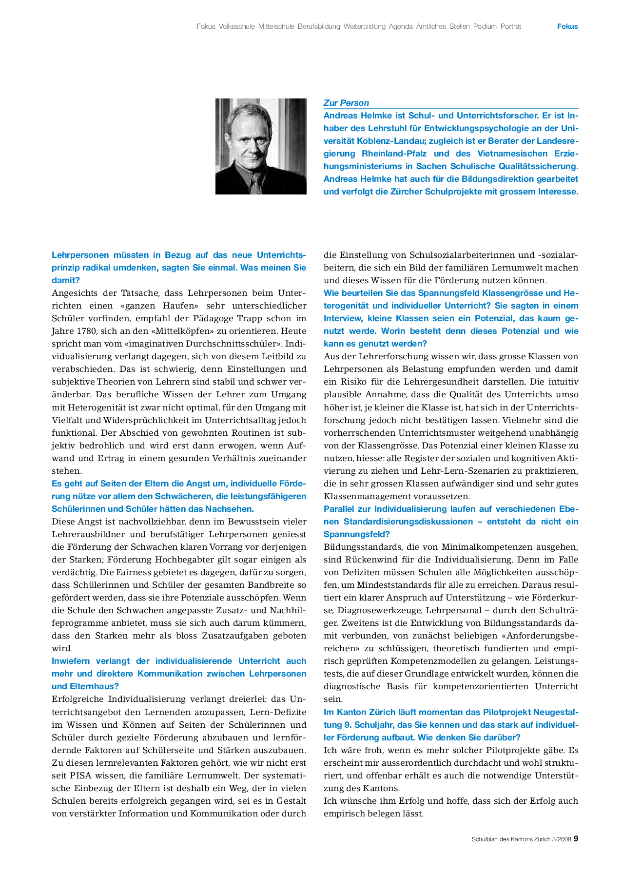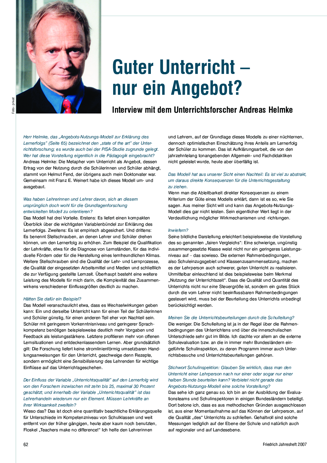Interview mit dem Unterrichtsforscher Andreas Helmke über das «Angebots-Nutzungs-Modell zur Erklärung des Lernerfolgs» (3 Seiten).