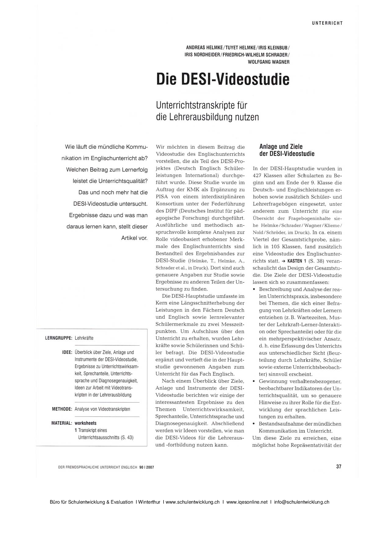 In diesem Zeitungsartikel geht es um die Entwicklung von geeigneten Instrumenten, mit denen man den Unterricht gezielt beobachten kann. Dazu zählt vor allem der fremde Blick, also die Evaluation des Unterrichts durch aussenstehende Personen.