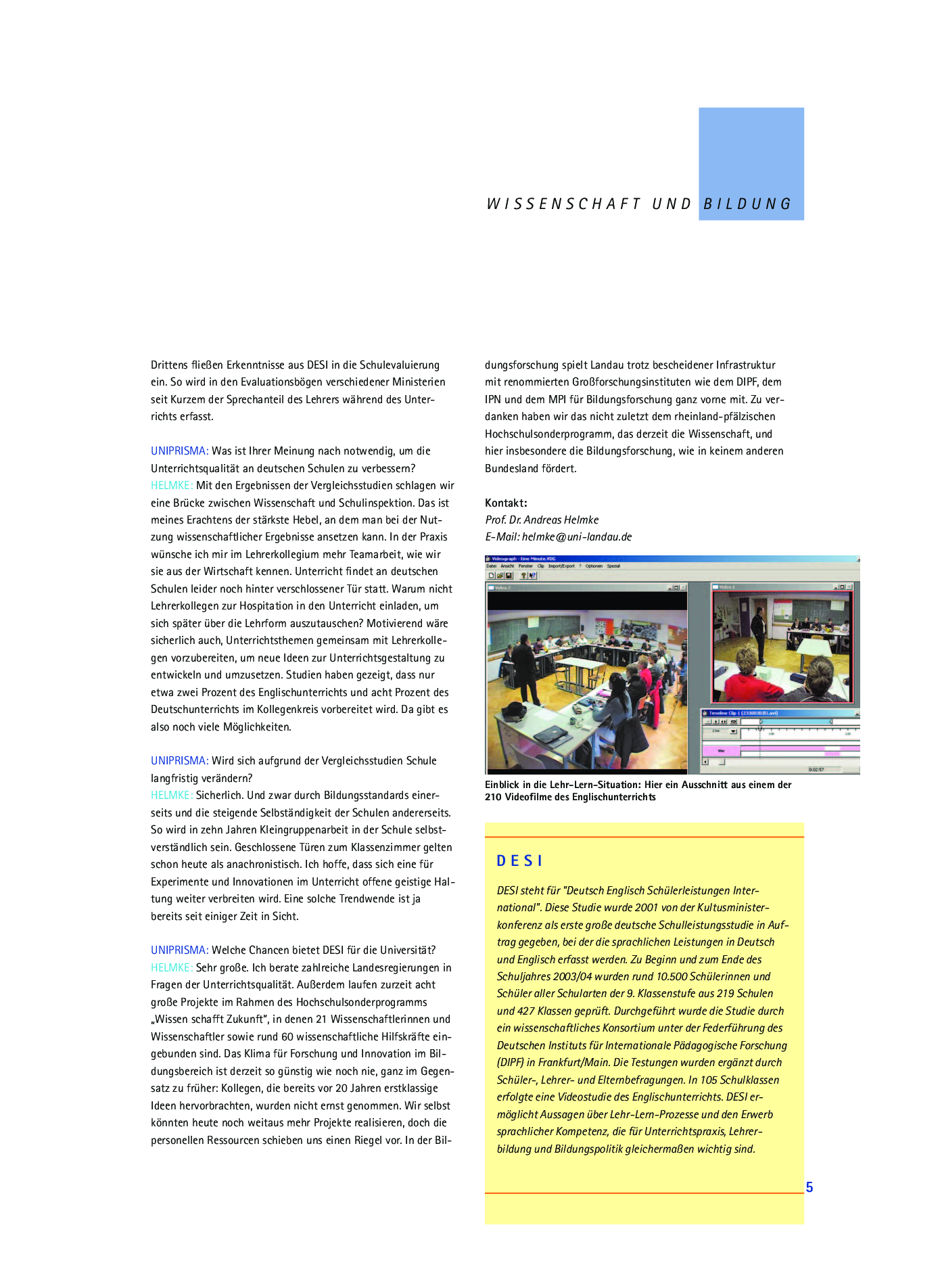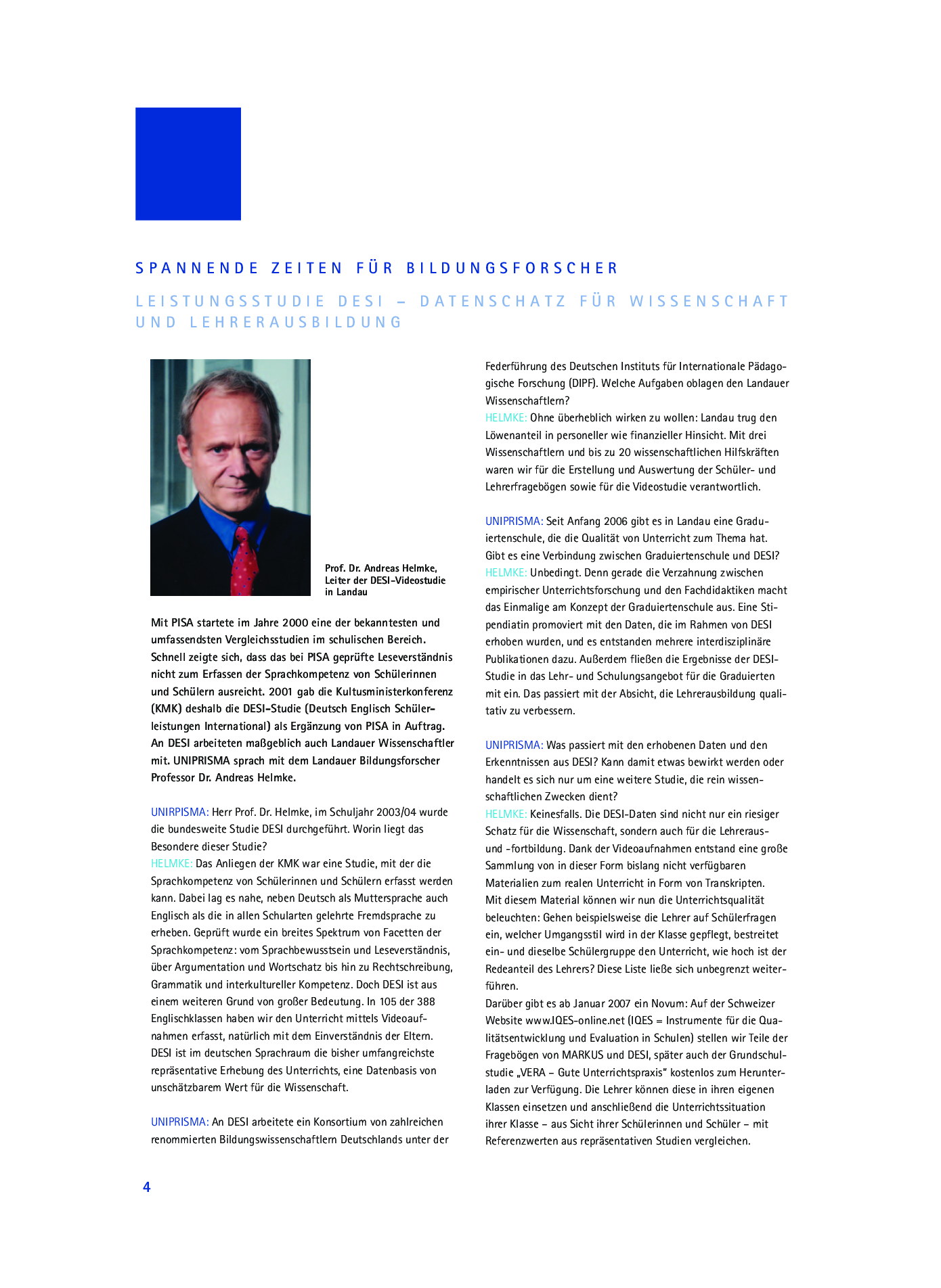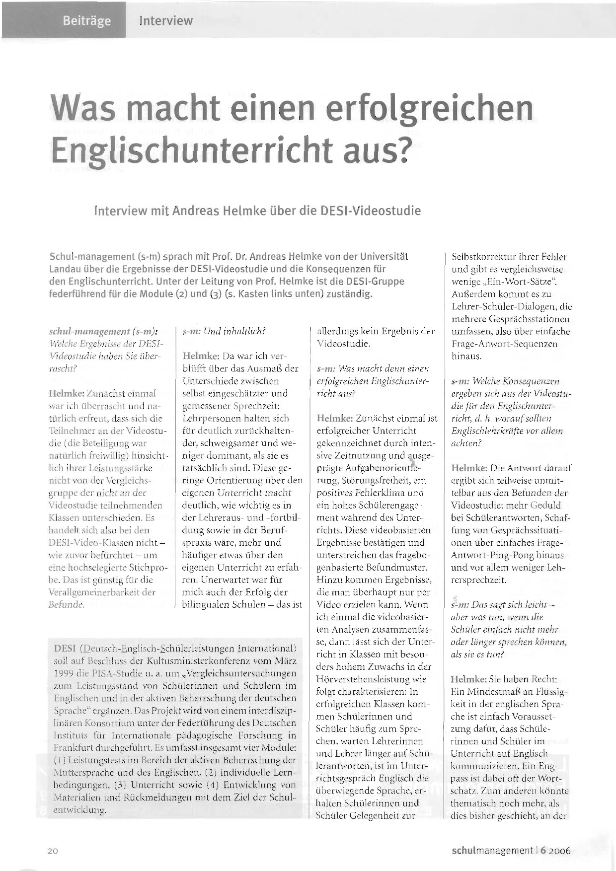 Andreas Helmke gibt im Interview Antwort auf Fragen zur DESI-Studie (Deutsch Englisch Schülerleistungen International), die als Ergänzung von PISA in Auftrag gegeben wurde.