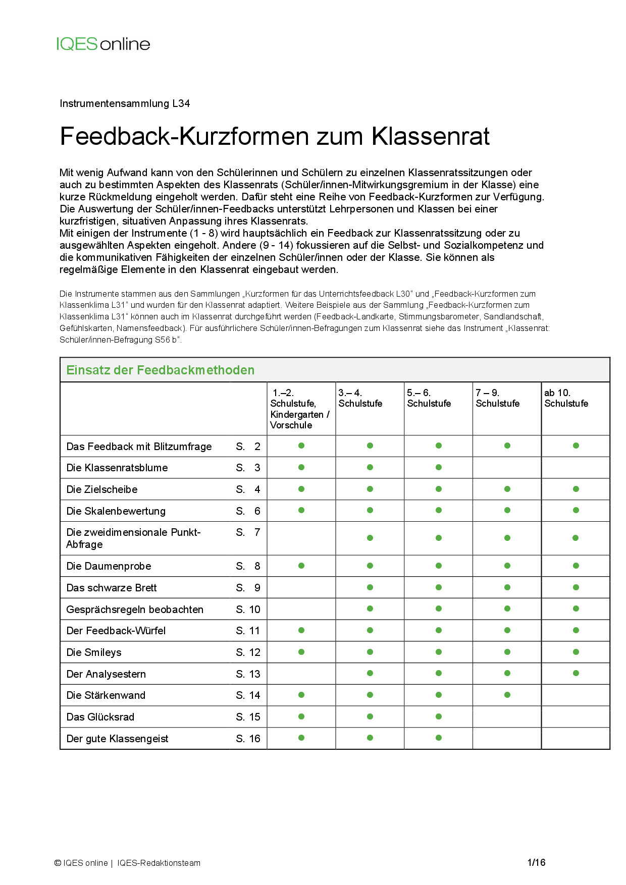 Mit einigen der Instrumente (1-8) wird hauptsächlich ein Feedback zur Klassenratssitzung oder zu ausgewählten Aspekten eingeholt. Andere (9-14) fokussieren auf die Selbst- und Sozial-Kompetenz und die kommunikativen Fähigkeiten der einzelnen Schüler/innen oder der Klasse. Sie können als regelmässige Elemente in den Klassenrat eingebaut werden.