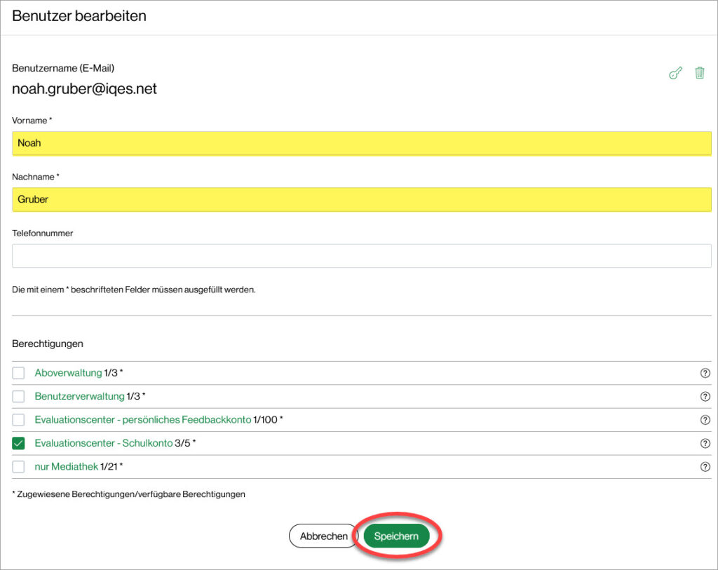 Geben Sie Vorname und Nachname ein. Optional können Sie zusätzlich die Telefonnummer eintragen. Setzen Sie anschliessend bei «Evaluationscenter – Schulkonto» einen Haken und klicken Sie dann auf «Speichern».