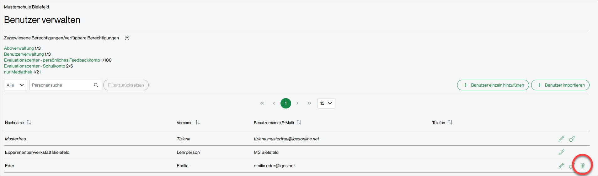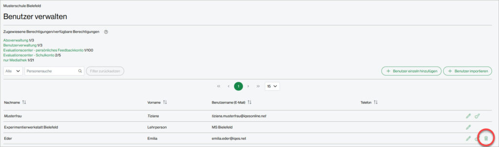 Klicken Sie bei der Benutzerin, die Sie löschen möchten, auf den Papierkorb am rechten Rand.