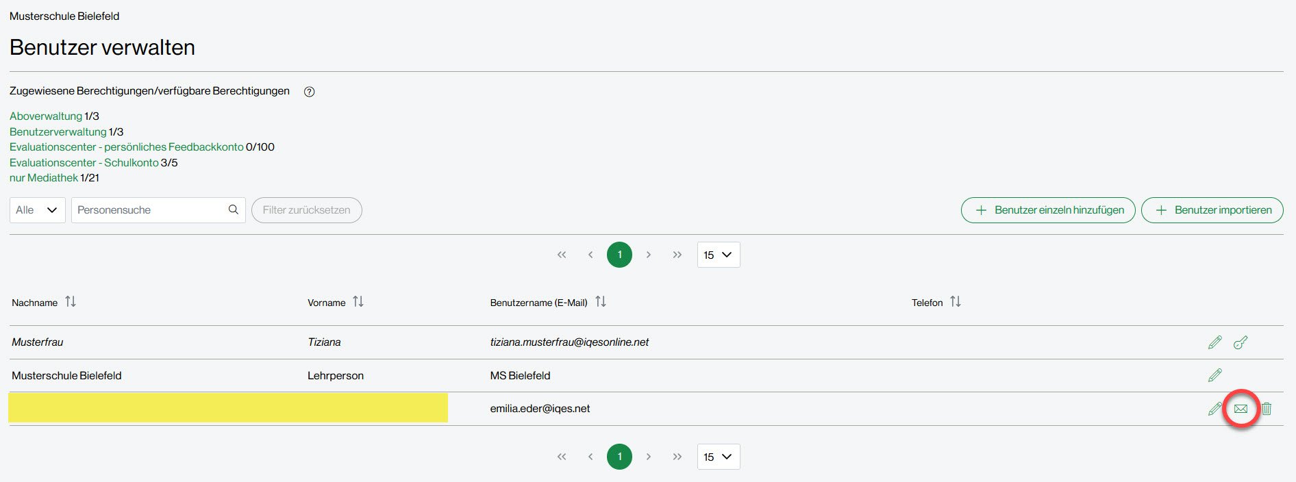 In der Liste der Benutzer erscheint die eingeladene Benutzerin jetzt ohne Vorname und Name. Mit einem Klick auf das Briefsymbol am rechten Rand lösen Sie die Einladungsmail ein weiteres Mal aus. Sobald die Benutzerin die Einladung angenommen hat, wird sie mit vollständigem Namen in der Übersicht angezeigt.