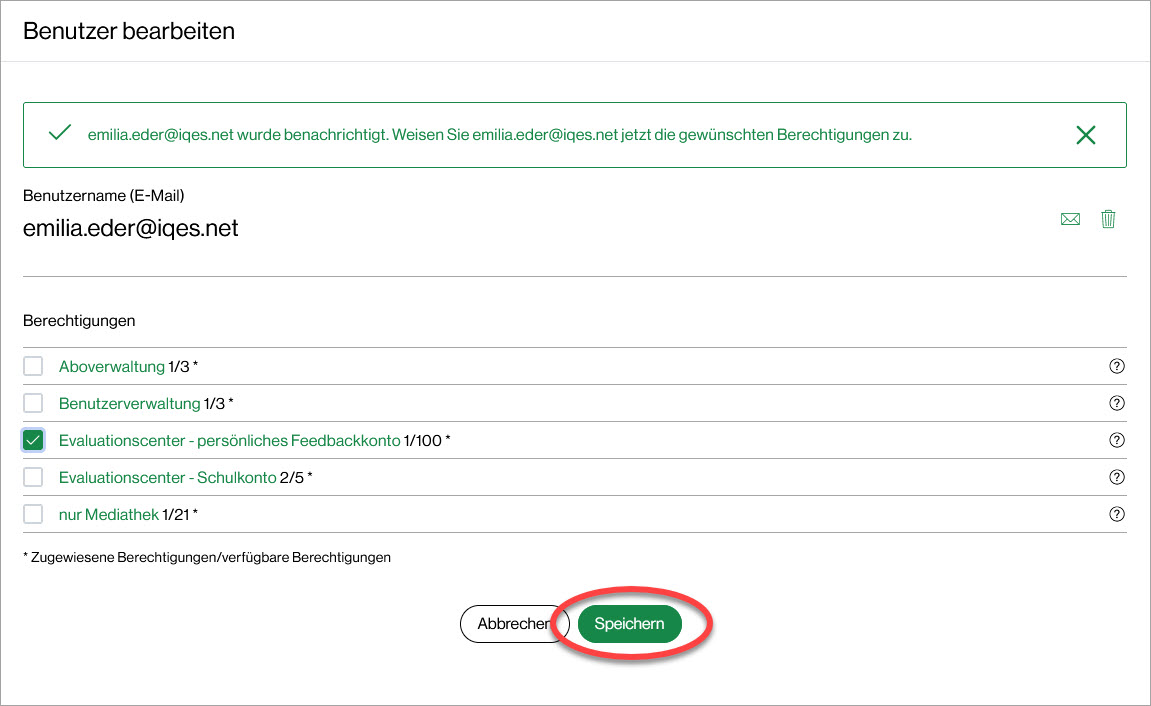 Schalten Sie die gewünschte Berechtigung für das Evaluationscenter ein: Schulkonto und/oder Persönliches Konto. Ausführliche Informationen zu den beiden Berechtigungen finden Sie hier: