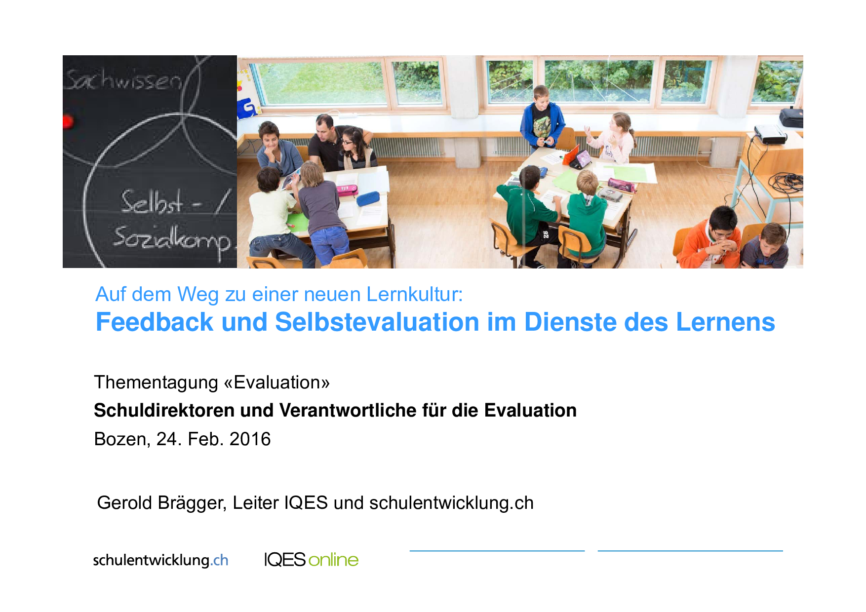 Diese Präsentation wurde anlässlich der Thementagung Evaluation vom 24. Februar 2016 in Bozen erstellt. Darin geht es um Feedback und Selbstevaluation im Dienste des Lernens. Es werden die Wirksamkeit sowie bewährte Methoden der Evaluation verhandelt.