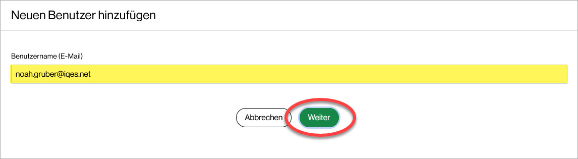 Schreiben Sie die E-Mail-Adresse des neuen Benutzers in das Feld «Benutzername (E-Mail)» und klicken Sie auf «Weiter».