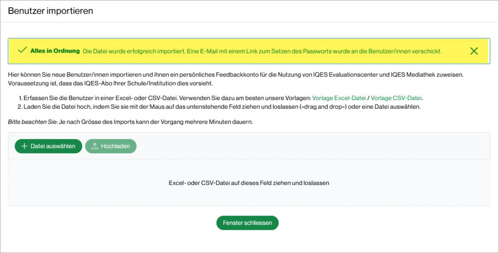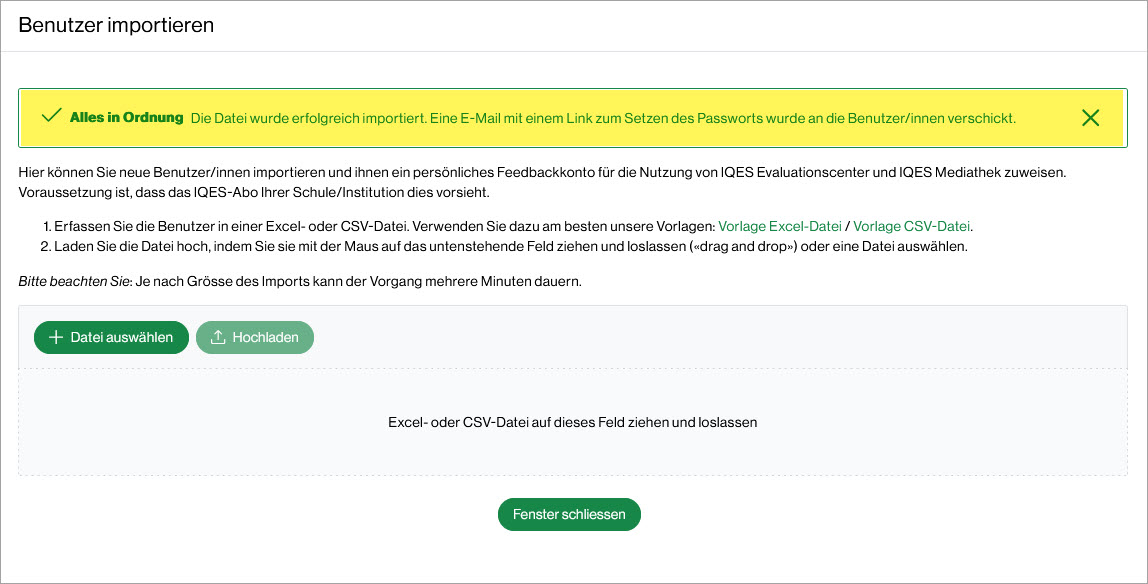 Wenn die Datei korrekt importiert werden konnte, erhalten Sie eine entsprechende Meldung. Schliessen Sie das Fenster, um die aktualisierte Benutzerliste zu sehen.