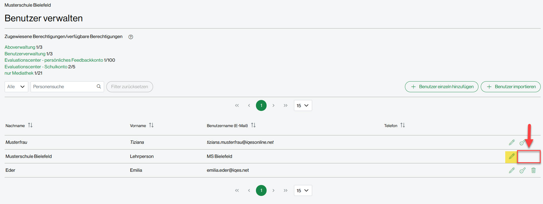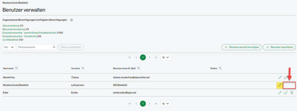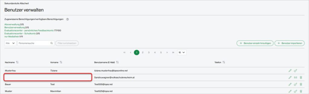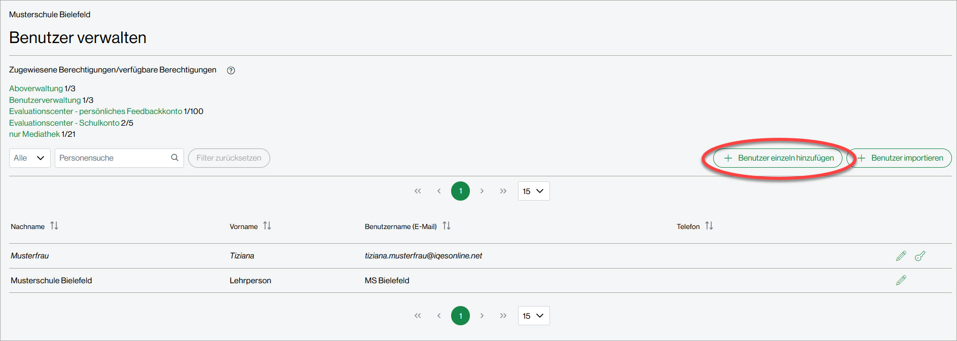 Hier sehen Sie die Liste der Benutzerinnen Ihrer Schule/Institution. Klicken Sie auf die Schaltfläche «Benutzer einzeln hinzufügen».