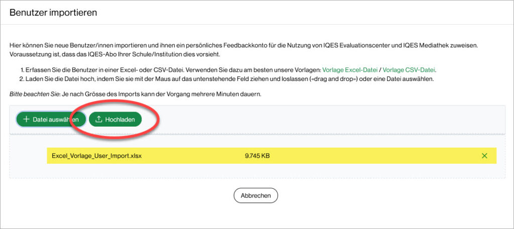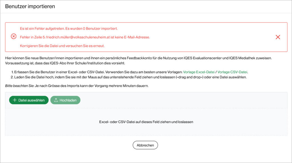 Es kann vorkommen, dass einige der importierten Benutzer/innen bereits ein IQES-Konto haben. Diese werden per E-Mail informiert, dass sie in Ihre Schule eingeladen worden sind. Damit sie sich in Ihre Schule einloggen können, müssen sie die Einladung annehmen.