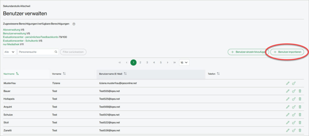 Hier sehen Sie die Liste der Benutzerinnen Ihrer Schule/Institution. Klicken Sie auf die Schaltfläche «Benutzer importieren».