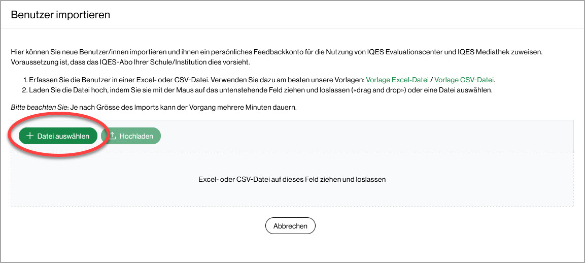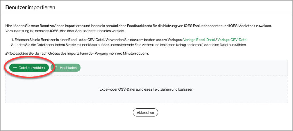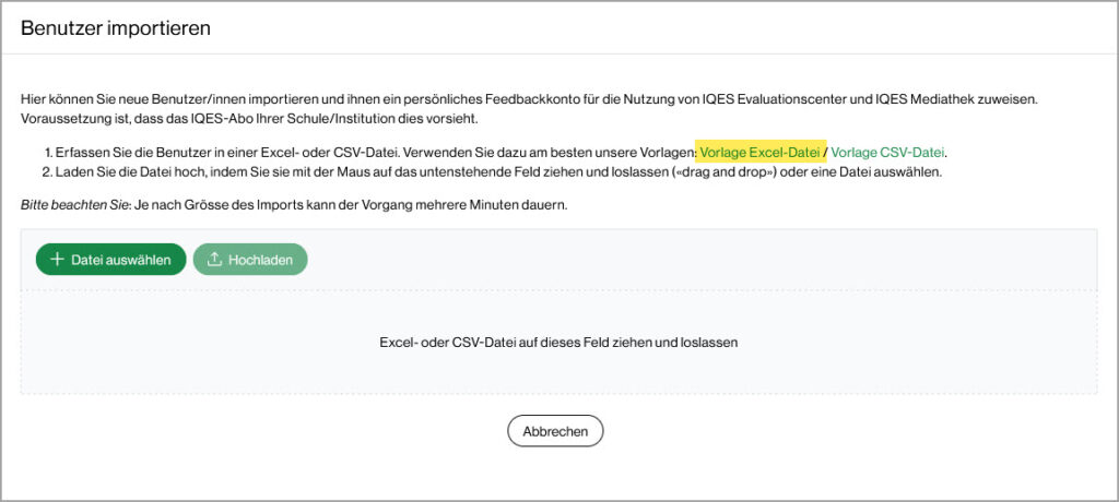 Allen Benutzern/-innen, die über die Importfunktion hinzugefügt wurden, wird automatisch die Berechtigung «Evaluationscenter – persönliches Feedbackkonto» zugewiesen.