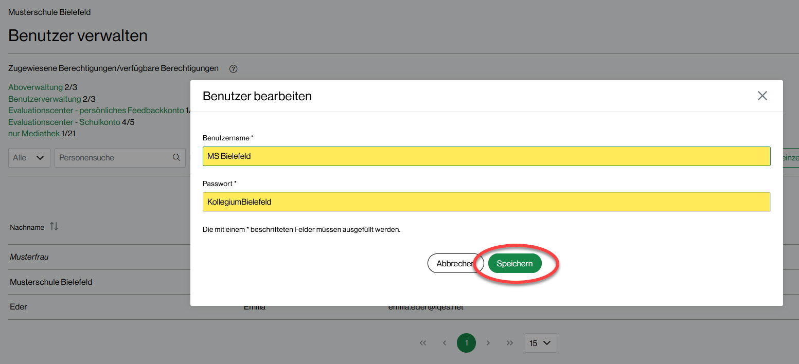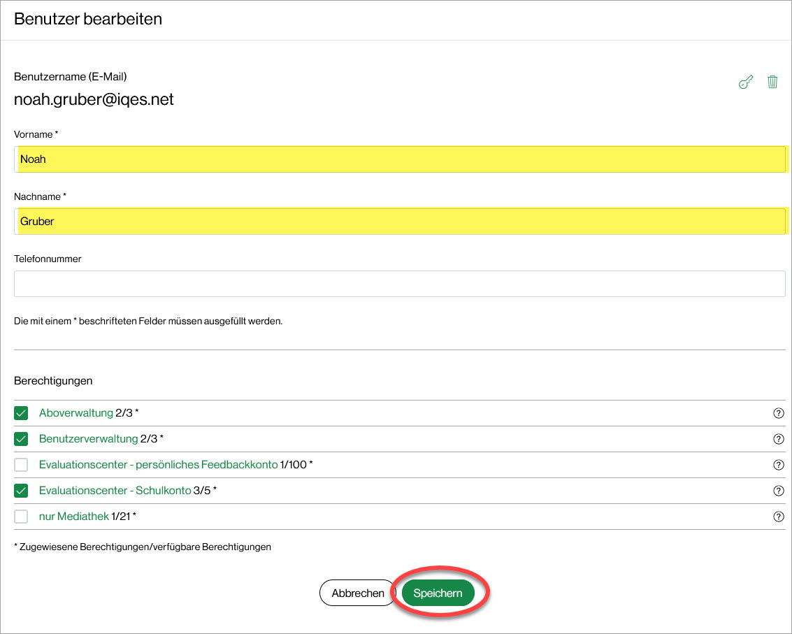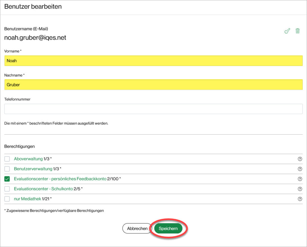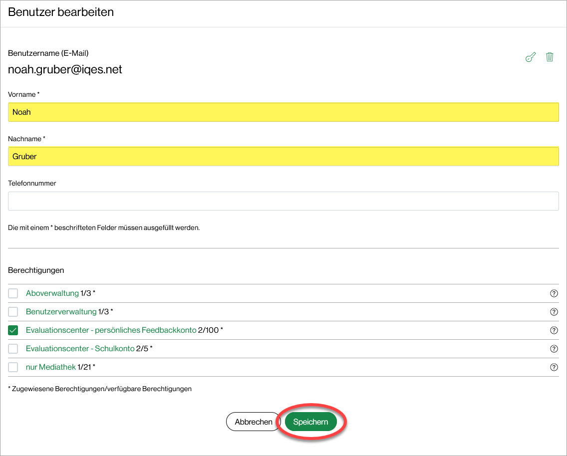 Bei Bedarf weisen Sie der Person weitere Berechtigungen zu, wie «persönliches Feedbackkonto» und «Schulkonto». Wenn Sie die Berechtigungen gesetzt haben, klicken Sie auf «Speichern». Die neue Benutzerin bekommt eine E-Mail und kann sich mit den darin enthaltenen Angaben ein Passwort setzen.