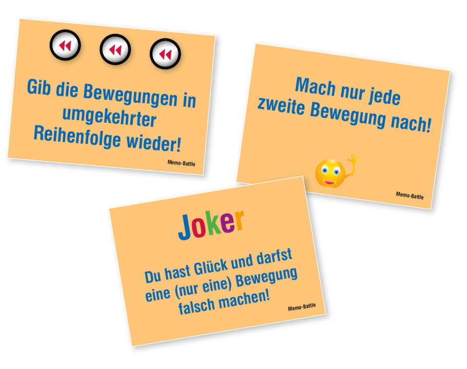 1 Stroop Steps 2 mursrednA 3 Bewegungskoffer 4 Memo-Battle 5 Move it – move it 6 Think & Dance 7 Crazy Circle 8 Clap & React 9 Colour Bouncing 10 Chaos Completto 11 Copy and Paste 12 Farbenjagd 13 Eckstein 14 Feuer, Wasser, Sturm extreme 15 Zombieballa-balla 16 Kombi-Jump