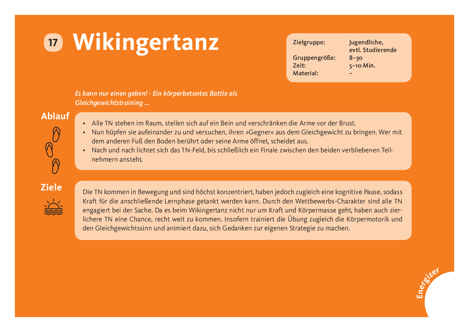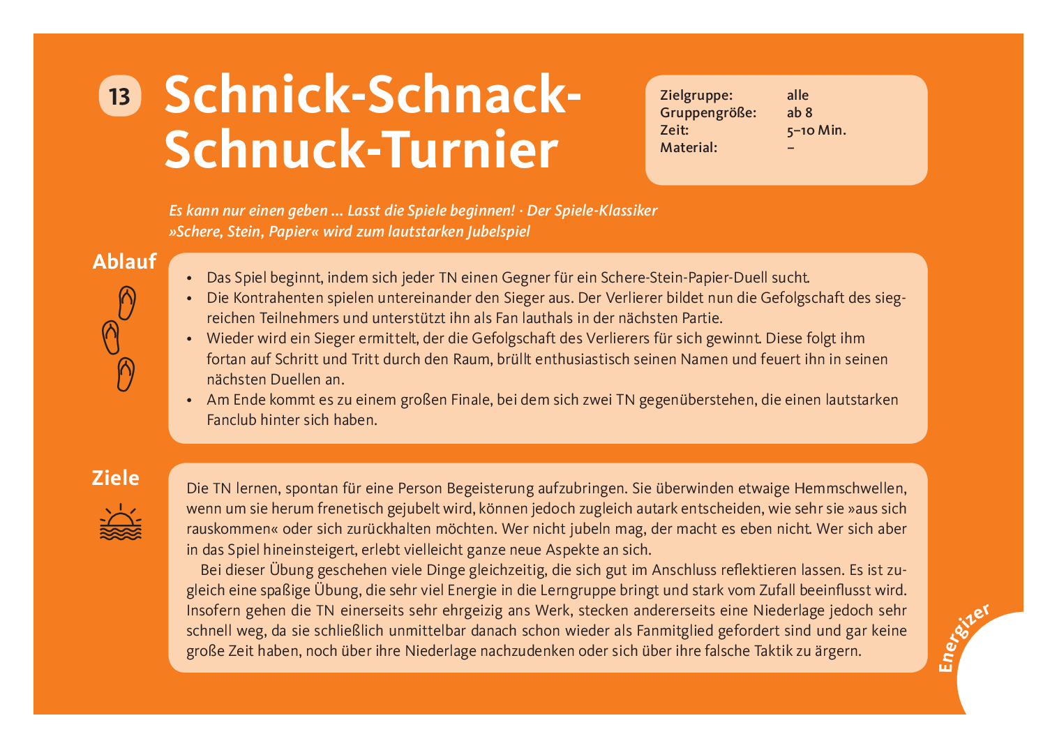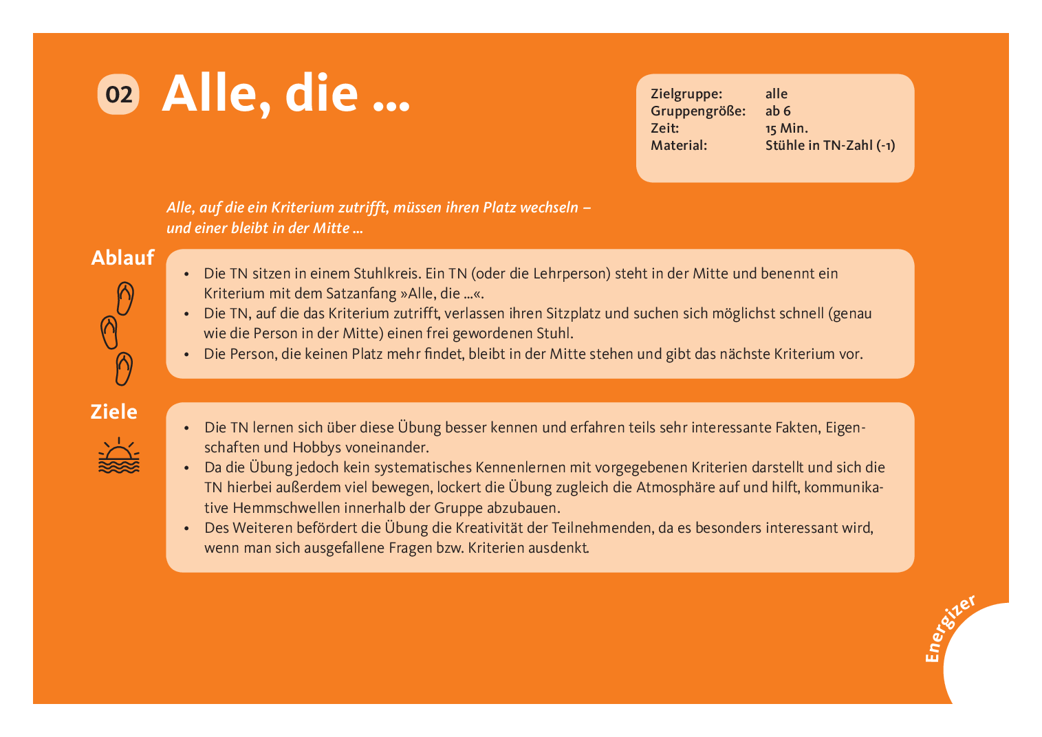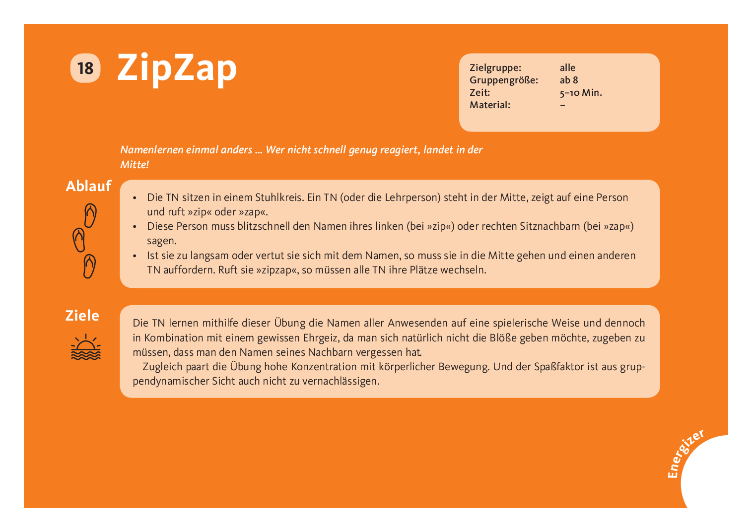 Energizer dienen der Aktivierung. Hier finden Sie Übungen, die neue Energie, neuen Schwung in das Lernsetting bringen und gewissermaßen den Akkustand der Teilnehmenden wieder aufladen.
