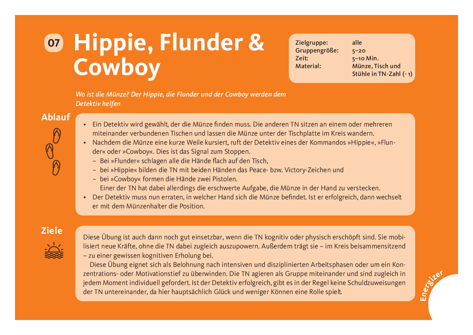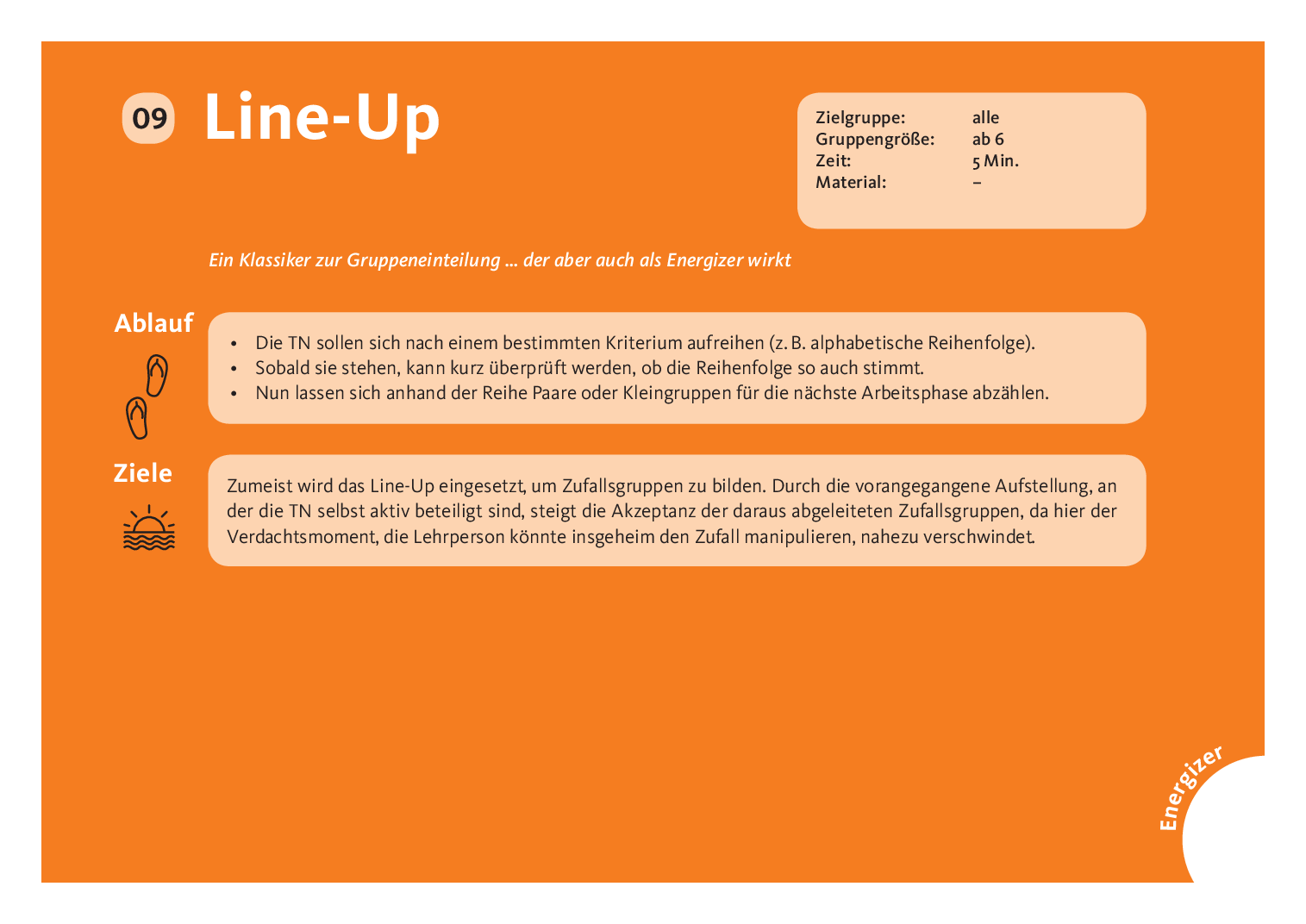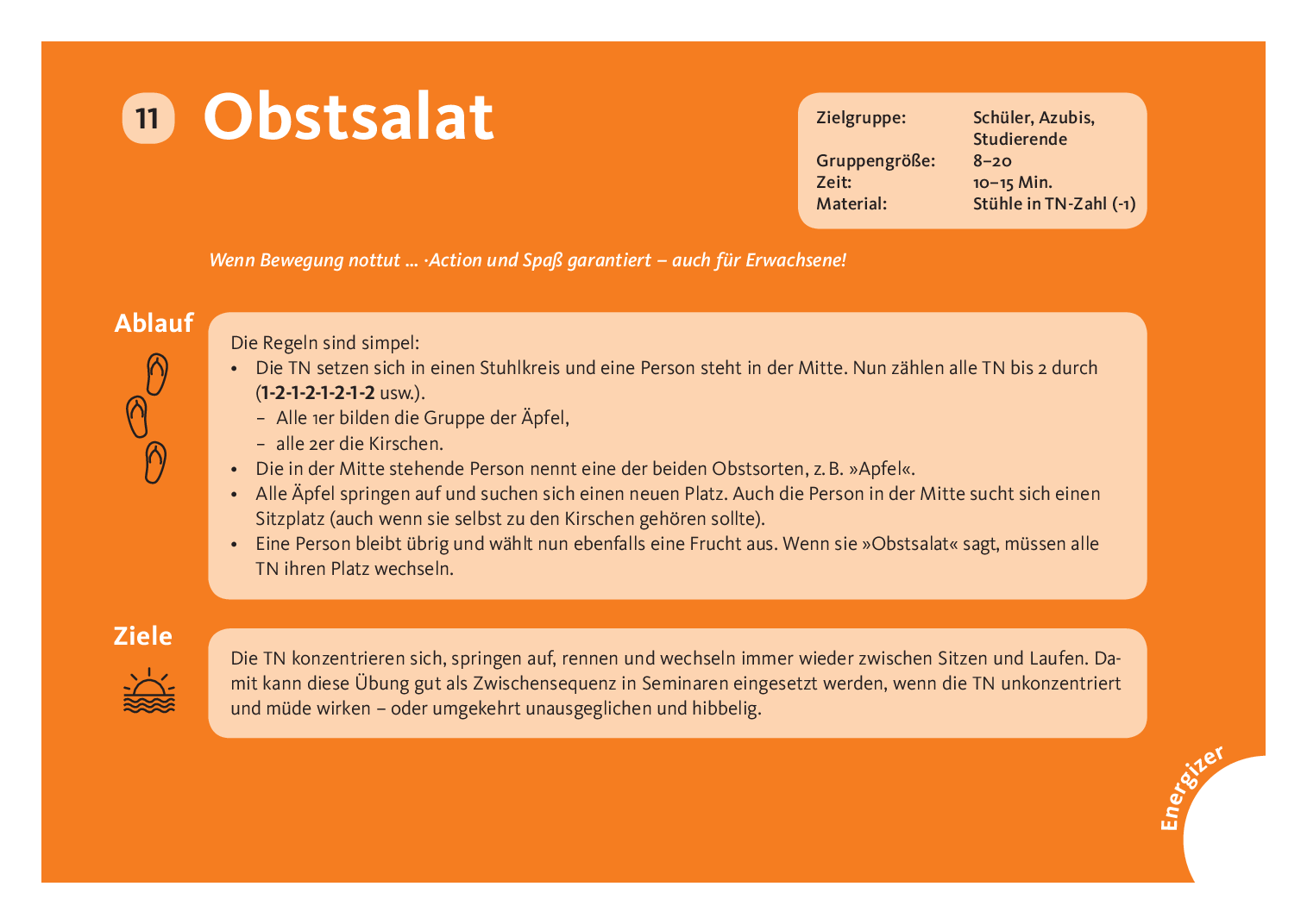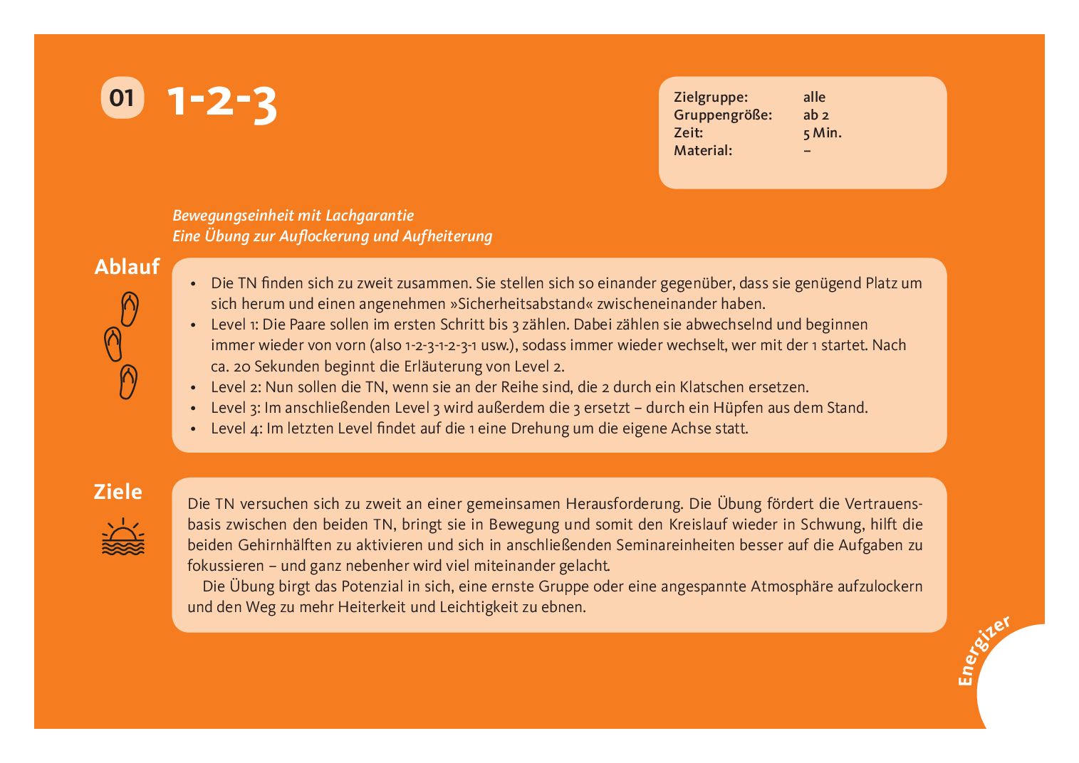 Energizer dienen der Aktivierung. Hier finden Sie Übungen, die neue Energie, neuen Schwung in das Lernsetting bringen und gewissermaßen den Akkustand der Teilnehmenden wieder aufladen.