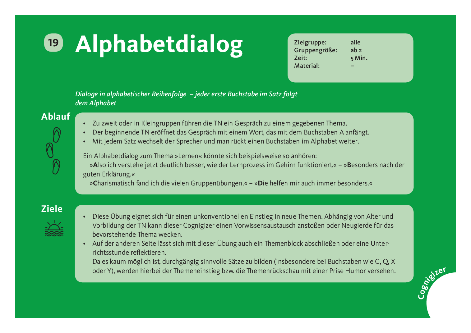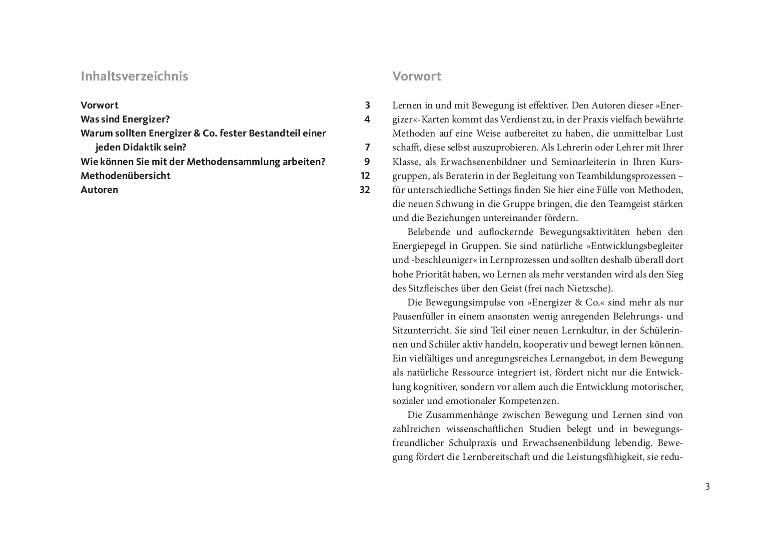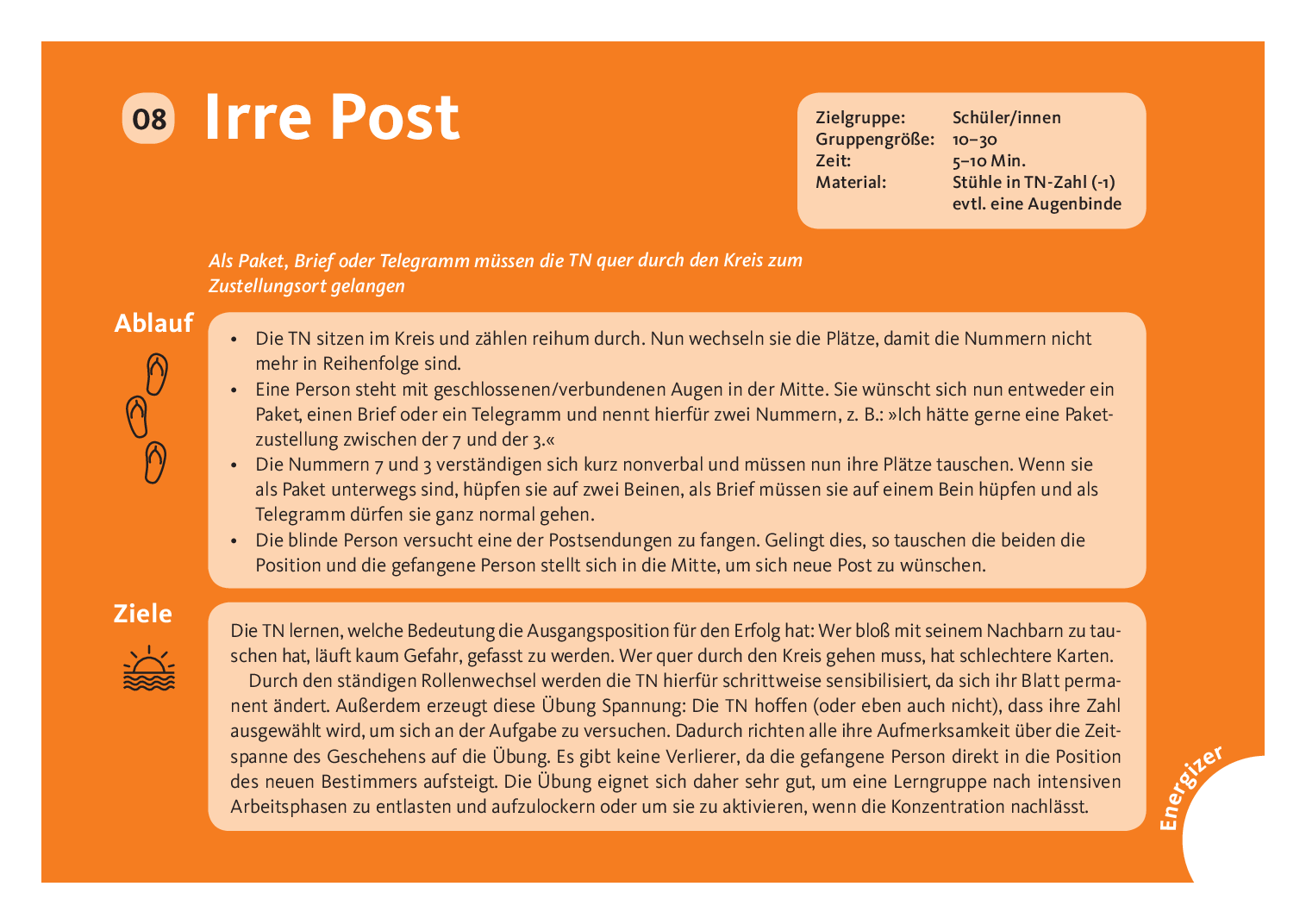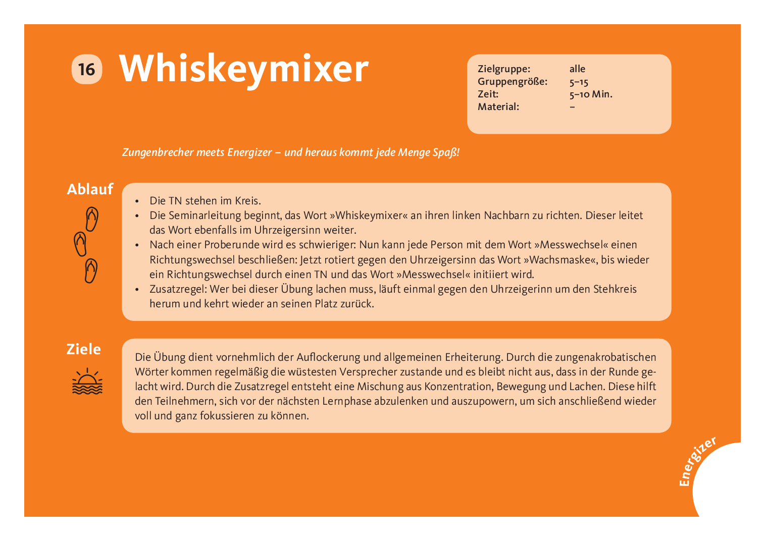 Energizer dienen der Aktivierung. Hier finden Sie Übungen, die neue Energie, neuen Schwung in das Lernsetting bringen und gewissermaßen den Akkustand der Teilnehmenden wieder aufladen.