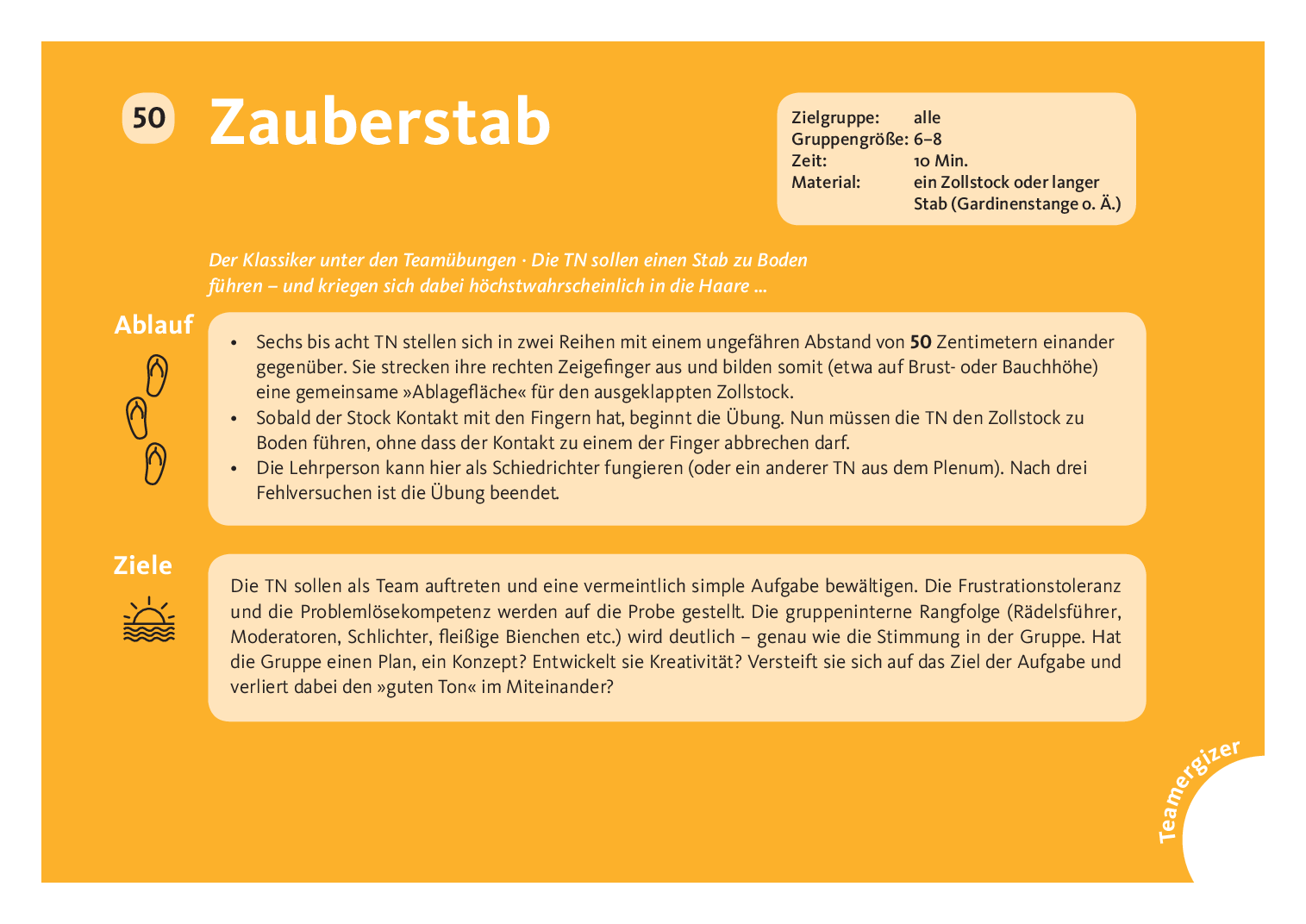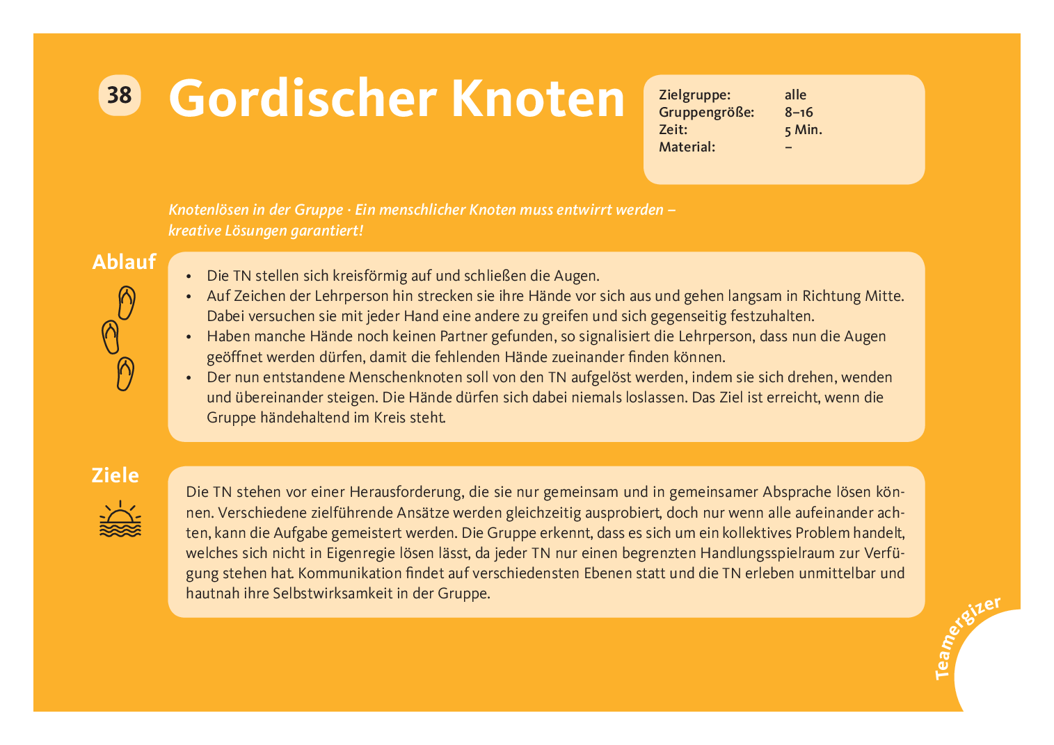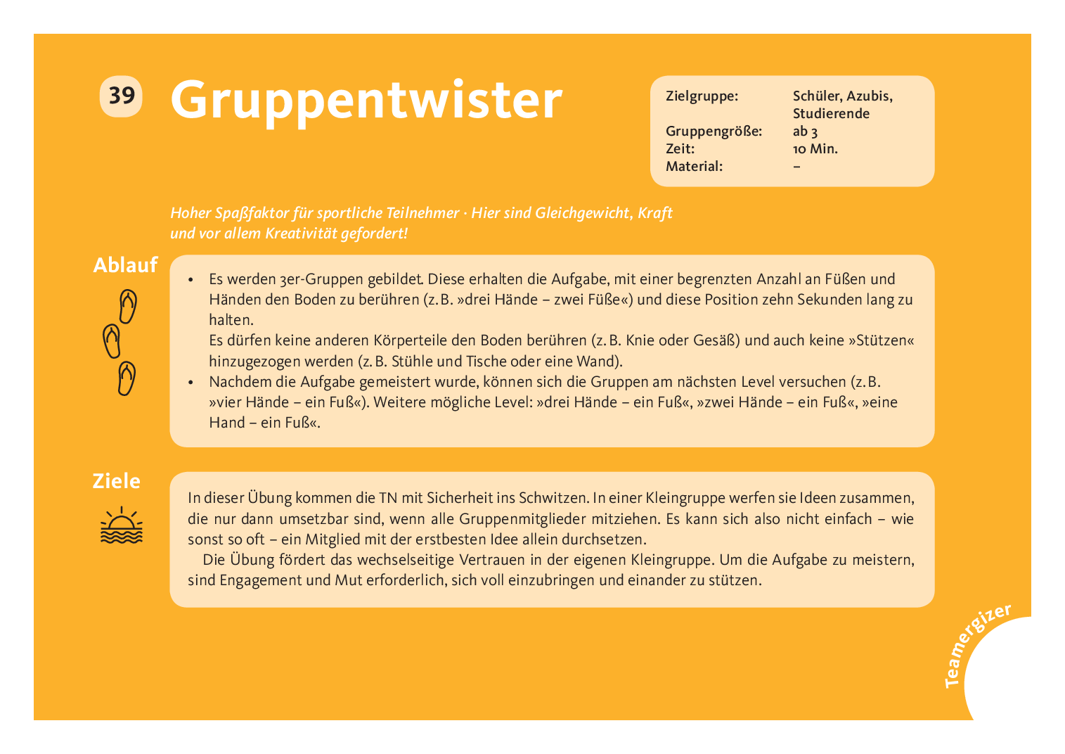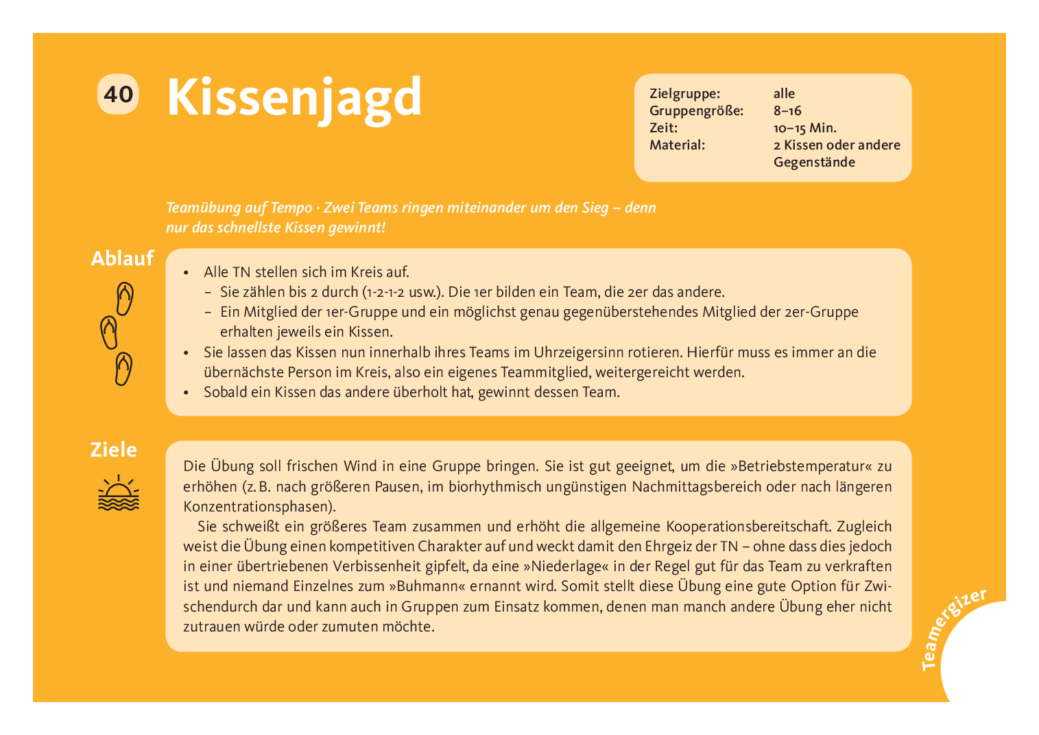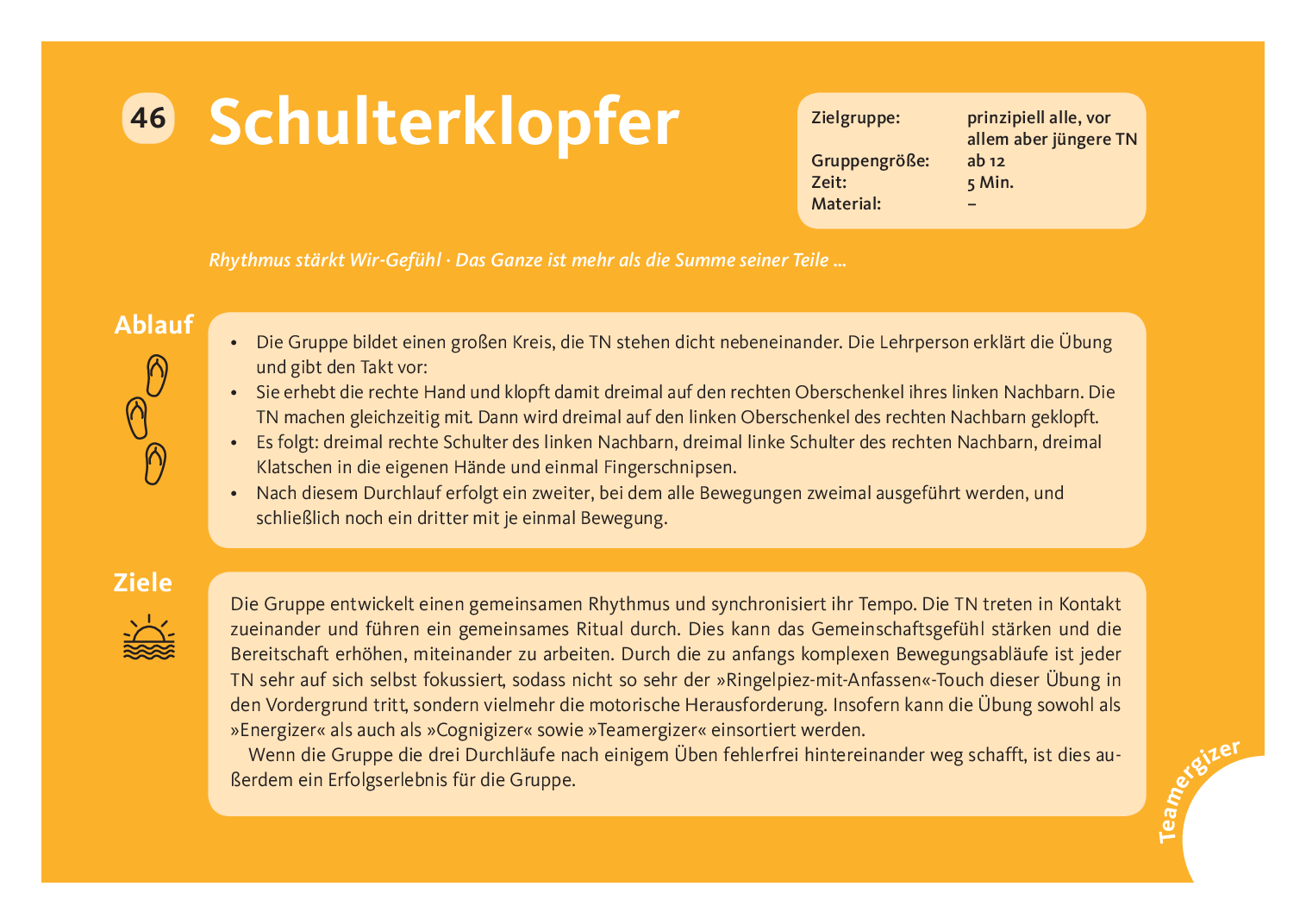Teamergizer sind natürliche Entwicklungsbegleiter und -beschleuniger in Teambildungsprozessen. Teambuilding-Übungen gibt es unzählige, und wir hatten bei der Zusammenstellung keinesfalls den Anspruch, eine besonders umfangreiche Sammlung zu erstellen. Wir haben vielmehr den Fokus auf solche Übungen gerichtet, die einen teambildenden und zugleich aktivierenden Charakter haben, schnell im Unterricht oder Seminar eingesetzt werden können, auch im Kontext der Erwachsenenbildung auf Akzeptanz stoßen, der Lehrperson keine Vorbereitung abverlangen und keine Materialschlacht erfordern.