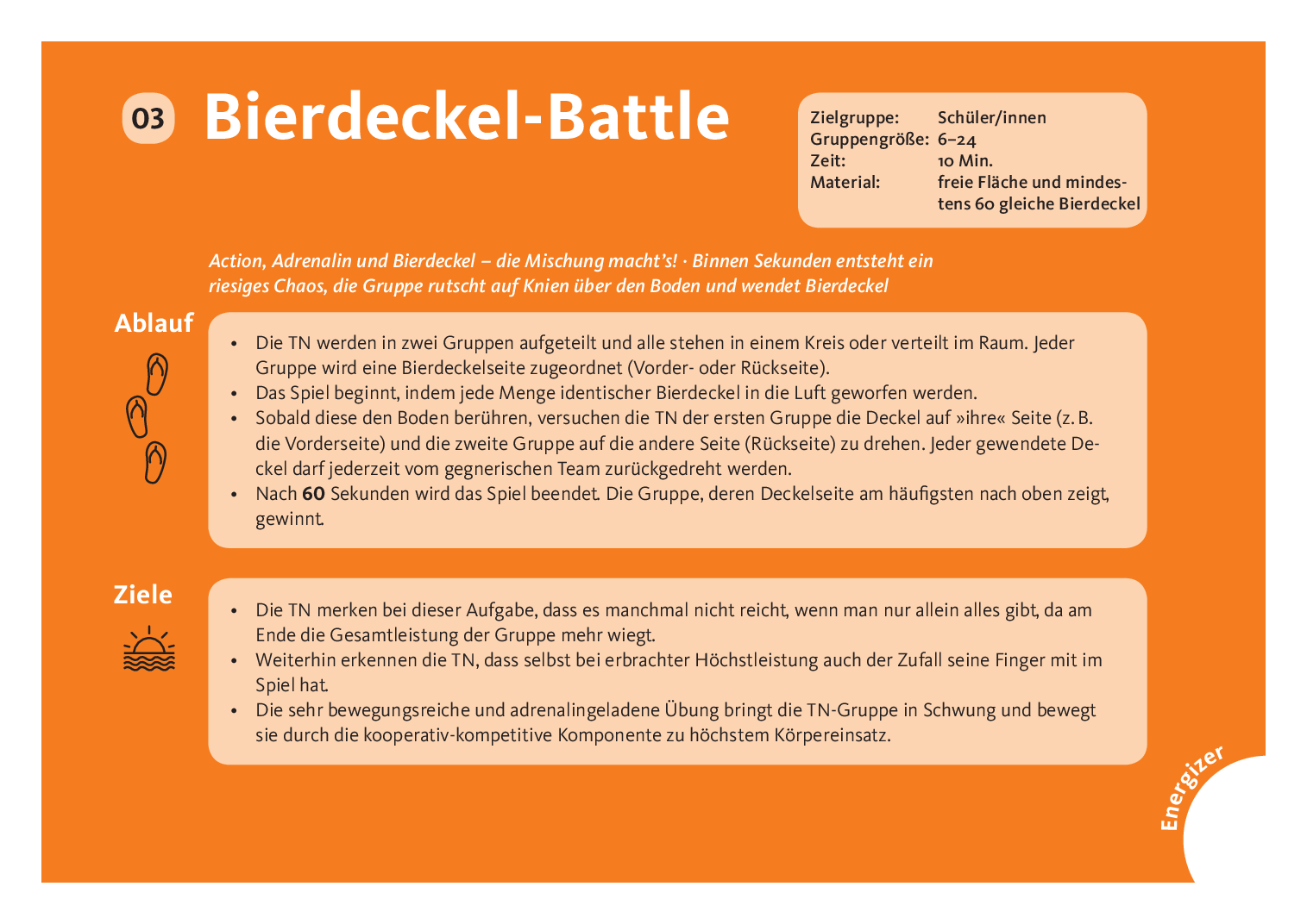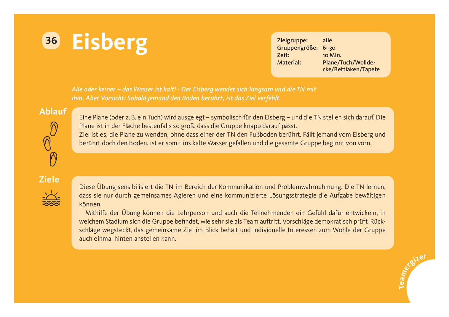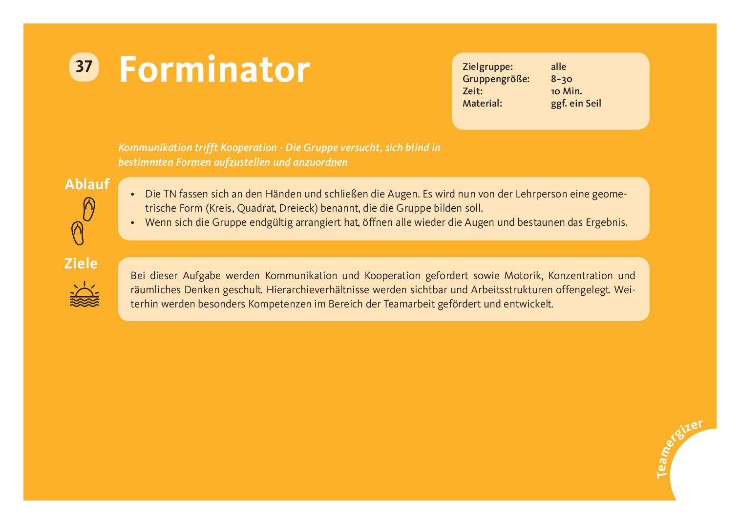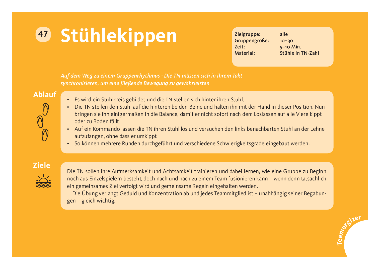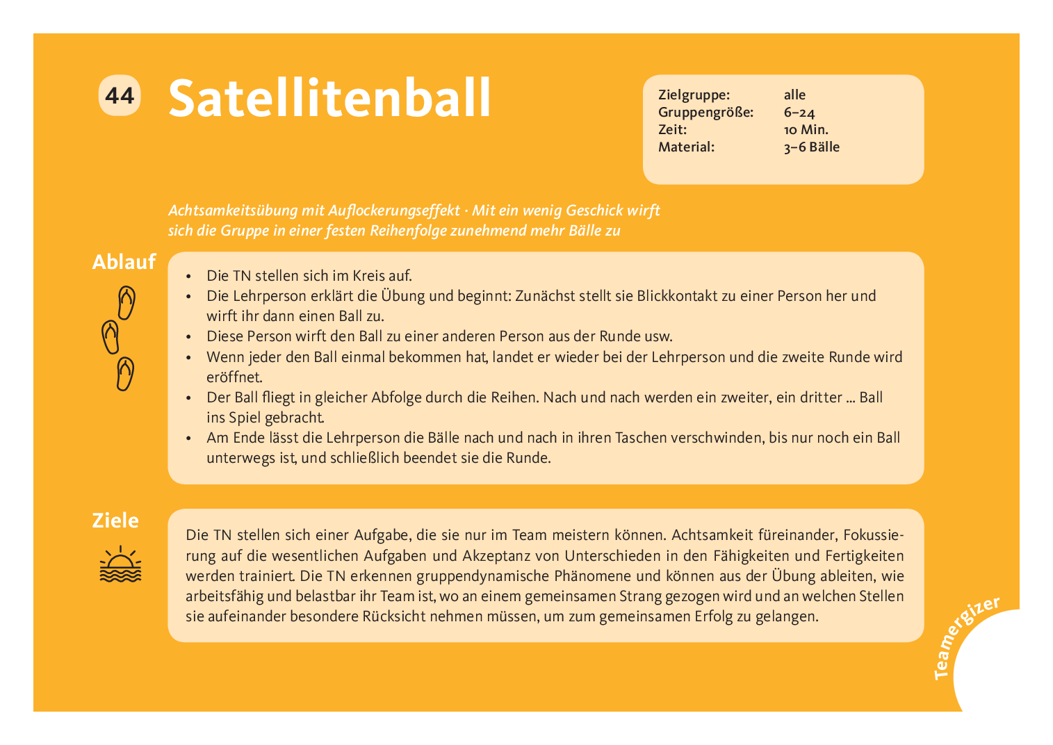 Teamergizer sind natürliche Entwicklungsbegleiter und -beschleuniger in Teambildungsprozessen. Teambuilding-Übungen gibt es unzählige, und wir hatten bei der Zusammenstellung keinesfalls den Anspruch, eine besonders umfangreiche Sammlung zu erstellen. Wir haben vielmehr den Fokus auf solche Übungen gerichtet, die einen teambildenden und zugleich aktivierenden Charakter haben, schnell im Unterricht oder Seminar eingesetzt werden können, auch im Kontext der Erwachsenenbildung auf Akzeptanz stoßen, der Lehrperson keine Vorbereitung abverlangen und keine Materialschlacht erfordern.
